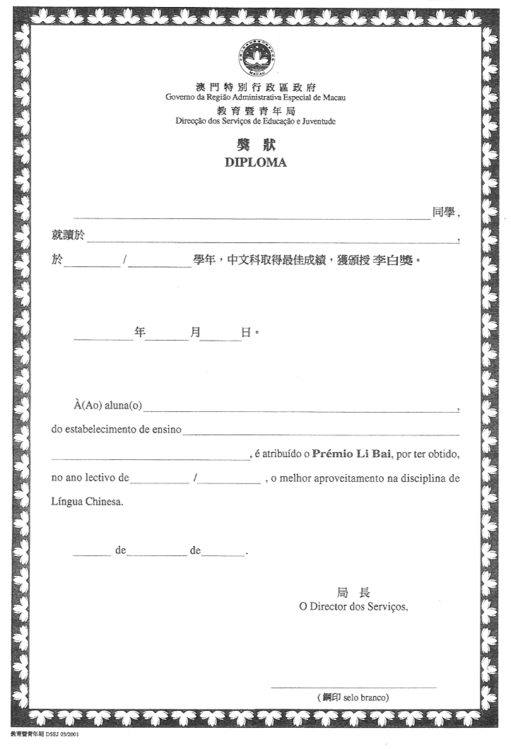 (六) 教育暨青年局 7/2001式樣為:文字黑色及邊緣藍色,印製於同一淺淡之底色上;