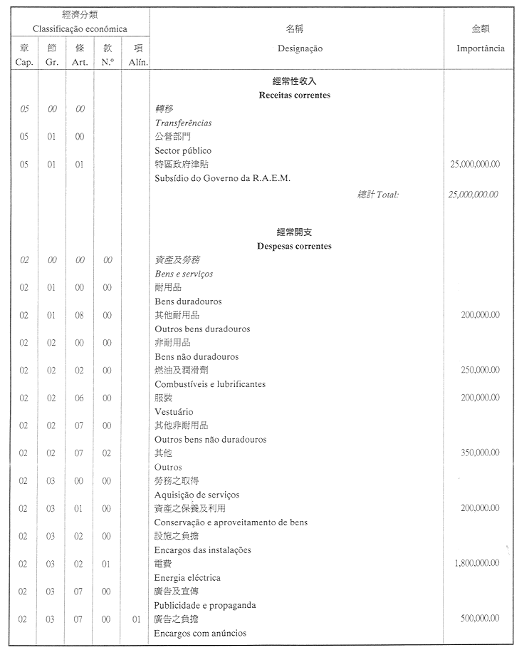 備註:經過二零零零年財政年度管理帳目結算後,二零零一年度臨時澳門市政局之本身預算由澳門幣肆億捌仟玖佰玖拾陸萬壹仟元(MOP489,961,000.00)改為澳門幣肆億玖仟柒佰肆拾萬零叁仟柒佰伍拾玖元玖角(MOP497,403,759.90)。