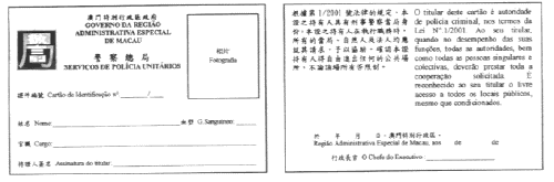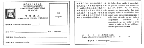 三、本批示附件的各工作證式樣為白色,規格為 80毫米 x 52毫米,左上方有第15/2001號行政命令所核准的彩色警察總局徽號。