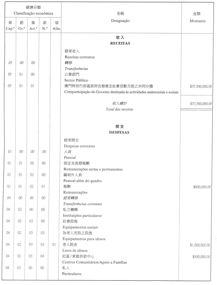 二、二零零一年之負擔由登錄於本年度澳門特別行政區財政預算第十五章「文化中心籌設委員會」內職能分類7-01-0經濟分類02-03-08-00項目為“資產及勞務——各項特別工作”之撥款支付。