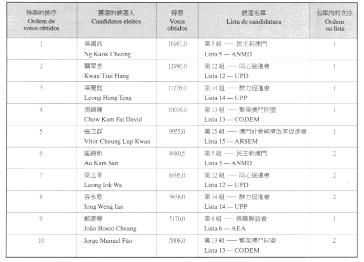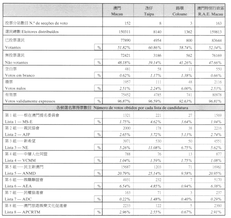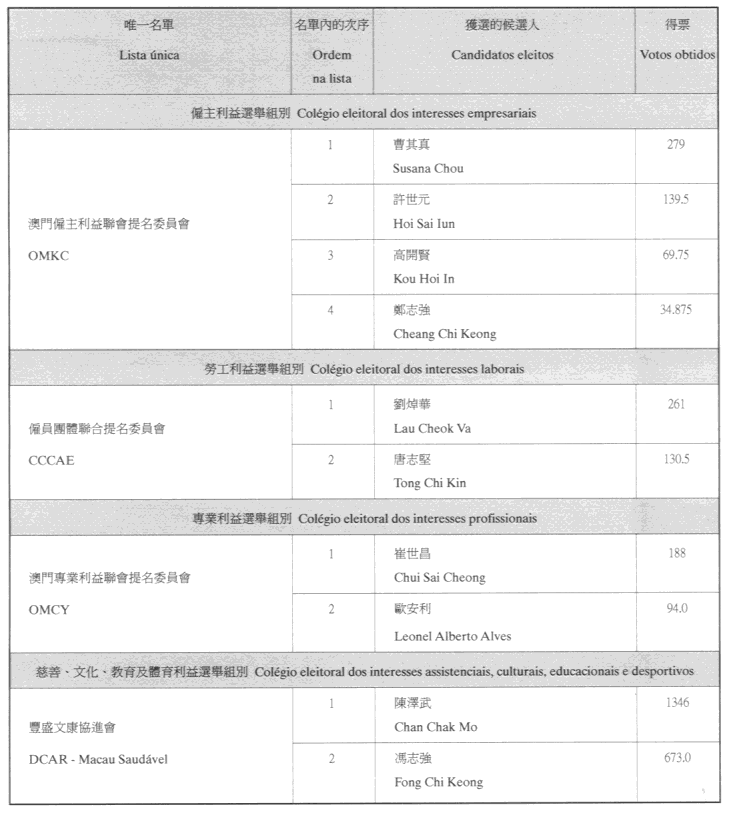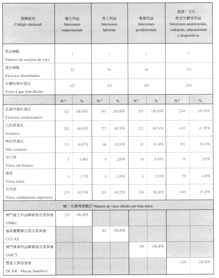 二零零一年九月二十三日舉行了澳門特別行政區立法會議員的直接選舉和間接選舉。鑒於在法定期限內沒有提起司法上訴,現根據由第3/2001號法律通過的《澳門特別行政區立法會選舉法》第一百三十六條第二款的規定,確定選舉的總核算結果,並宣佈獲選的候選人。