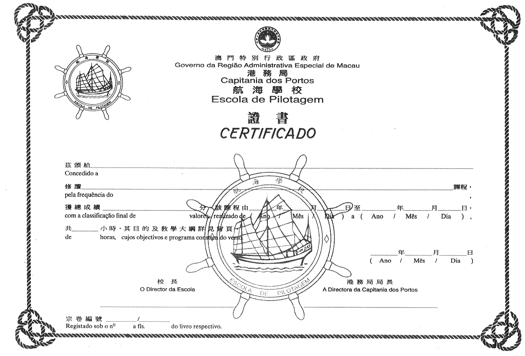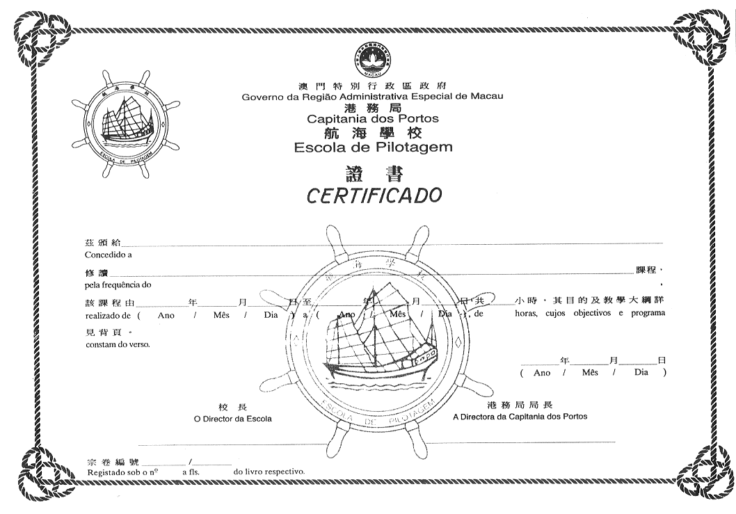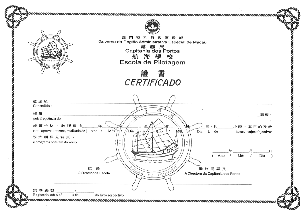 一、核准載於本批示附件內並作為本批示組成部分的證書和文憑式樣,該等證書和文憑由印務局專責印製,並作為完成由港務局航海學校開辦的各項課程及培訓課程的證明。