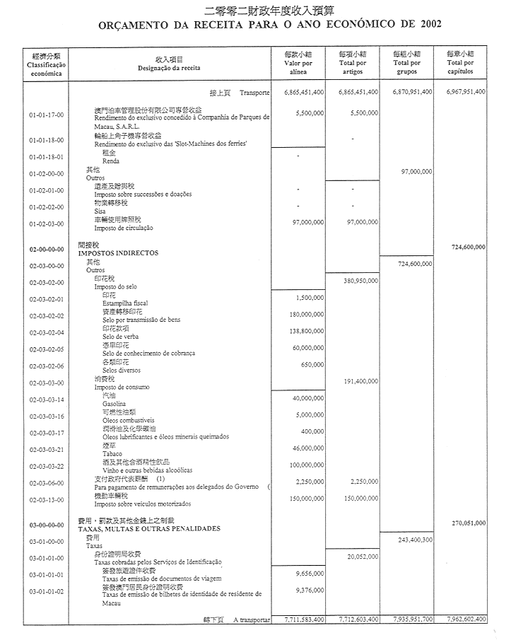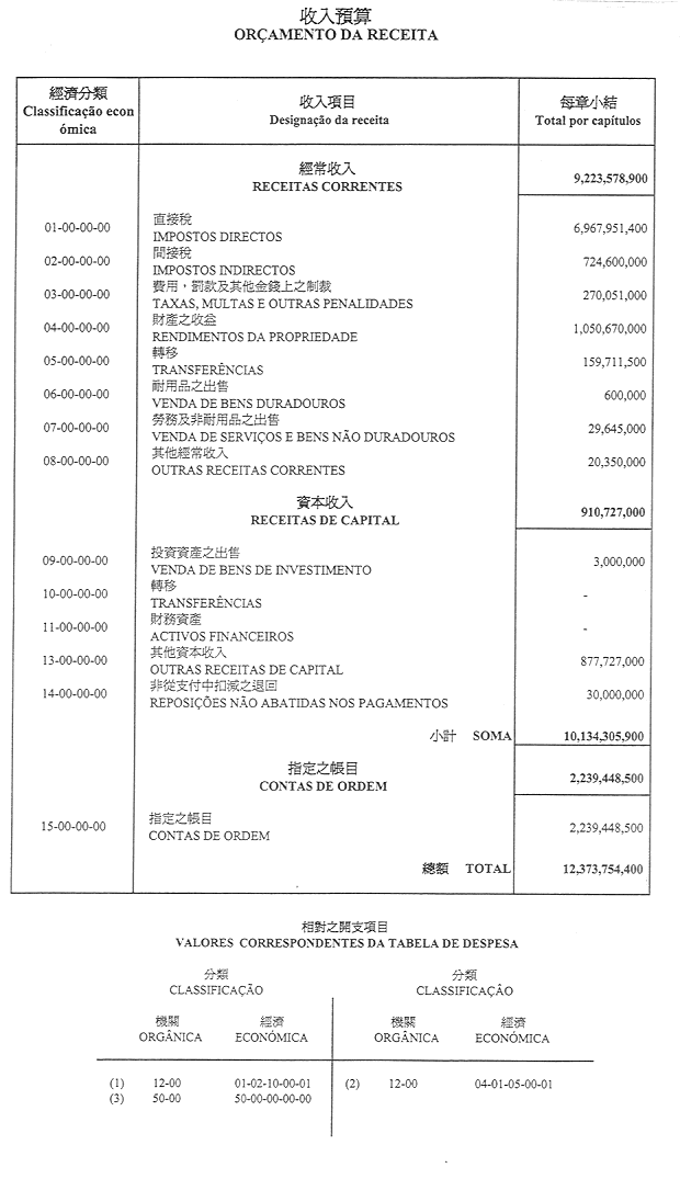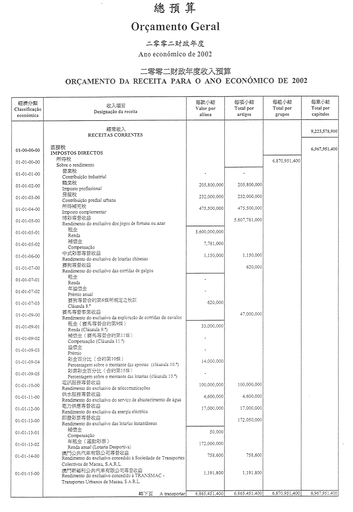 一、稅捐、直接與間接稅及其他收入之總所得預計為澳門幣12,373,754,400.00圓,並於二零零二年內按照現規範或將規範有關徵收之法律規定進行徵收;該總所得應根據現行法規之規定,用於支付二零零二年內所作之開支。