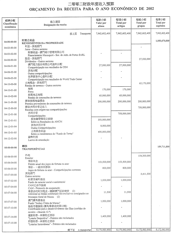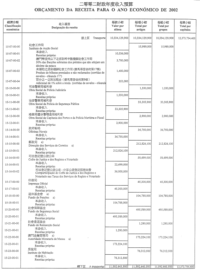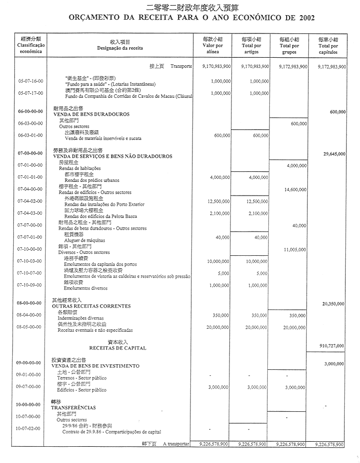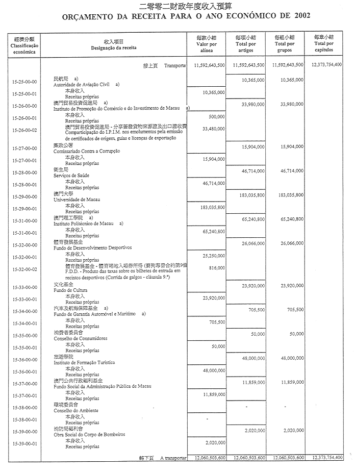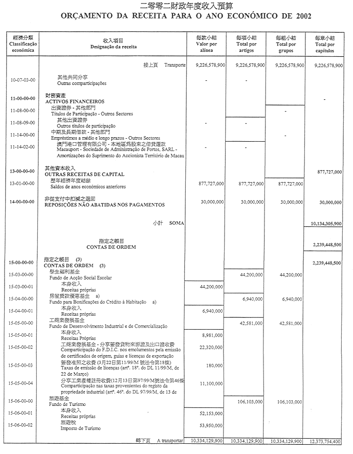 通過作為本法組成部份之二零零二財政年度澳門特別行政區財政預算(OR/2002),並由二零零二年一月一日起開始生效及執行。