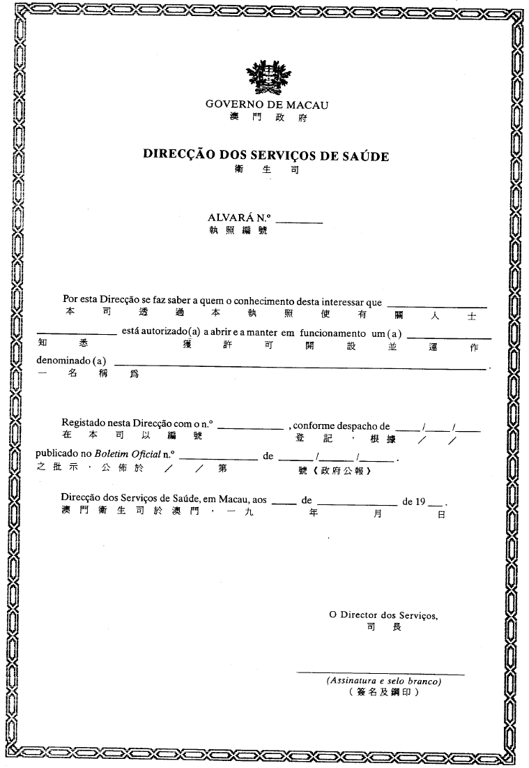 一、根據本法規之規定,獲准照之專業人士或獲執照之實體所使用之信、信封、處方及其他文件或紙張,必須以葡文及中文載明其姓名或所採用之名稱,以及准照或執照上所載之職業或所從事之業務。