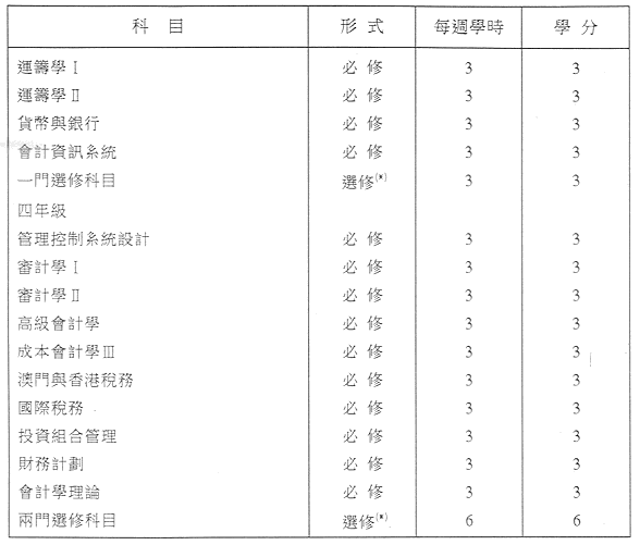 (*)選修科目由學生自工商管理學院院長指定的一套選修科目中選擇;一年級選修兩門,二年級選修四門,三年級和四年級各選修六門科目。