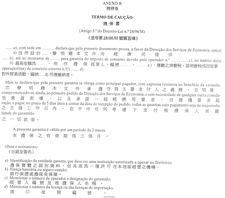 按每一進口個案擔保制係指以附件B所指之整體擔保確保繳納因進行第一條產品之一項或多項進口而應繳之消費稅。