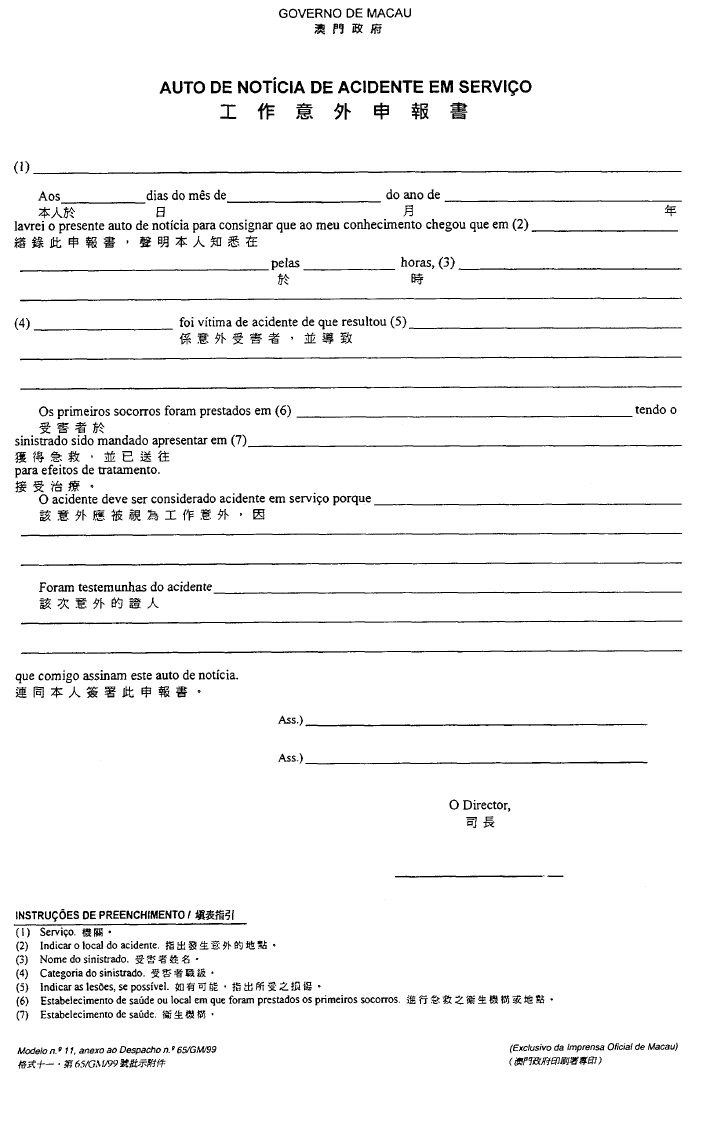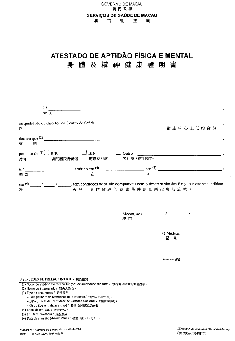 根據經十二月二十八日第62/98/M號法令修改的《澳門公共行政工作人員通則》,其中規定表格的式樣要由總督的批示批准;