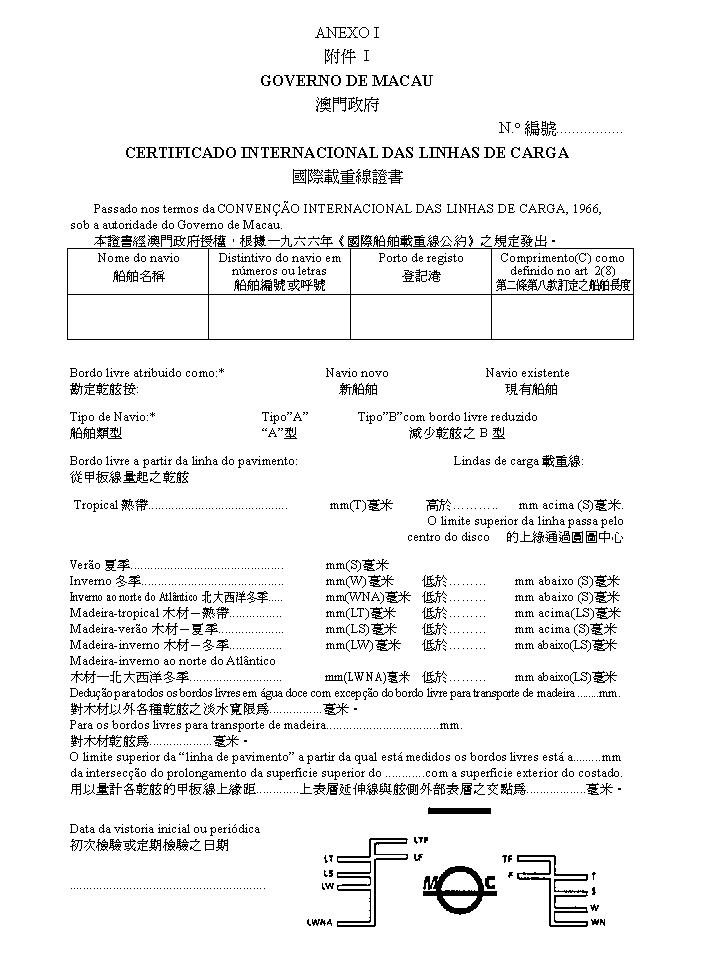 根據十一月二十九日第90/99/M號法令核准之《海事活動規章》第六十四條第四款之規定,國際載重線證書及國際乾舷免除證書之式樣及發出條件由訓令核准。