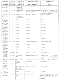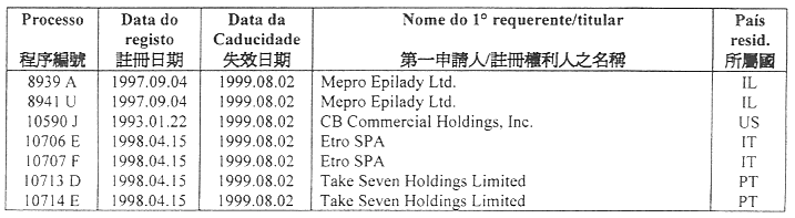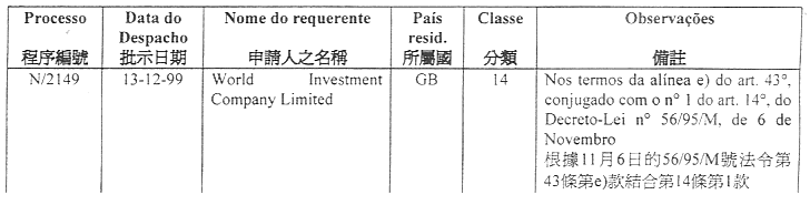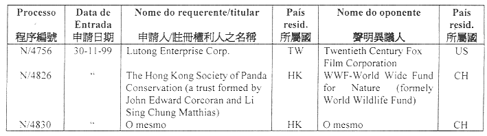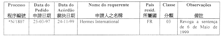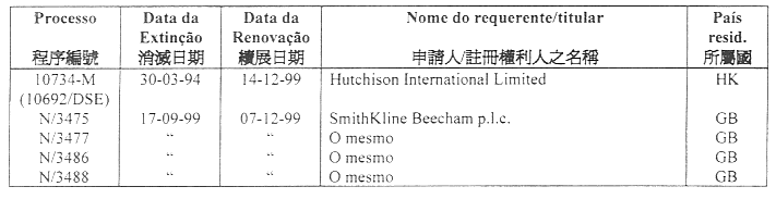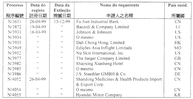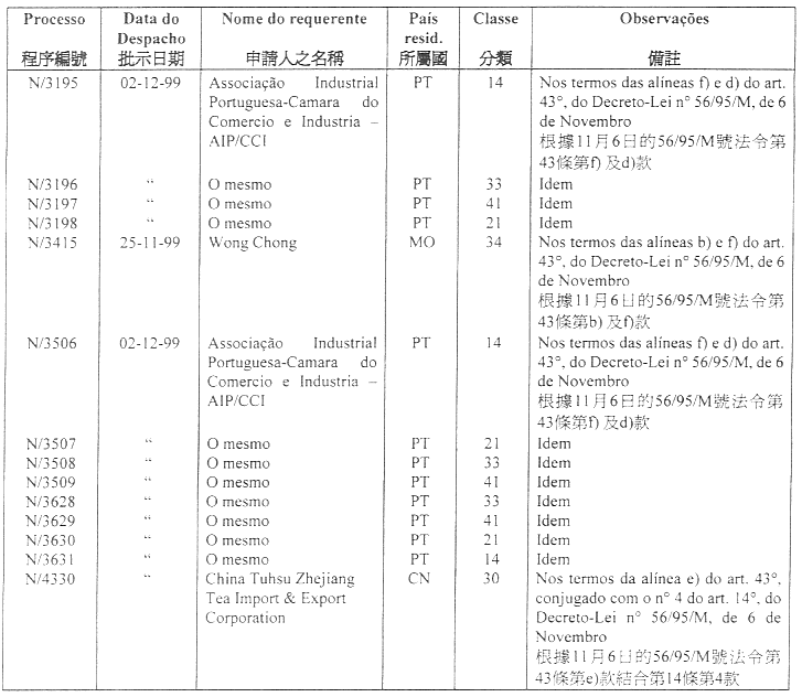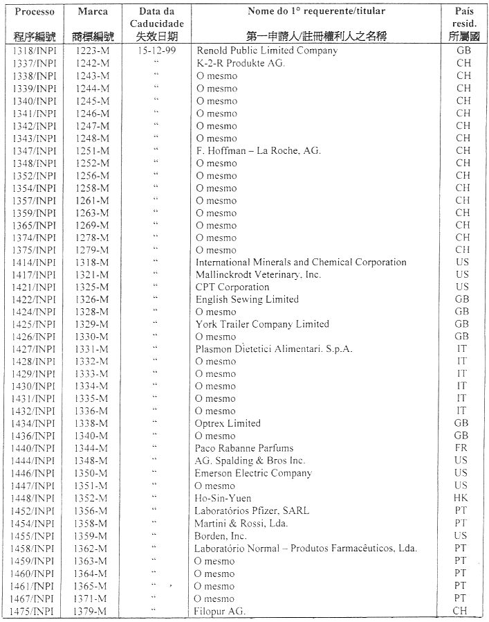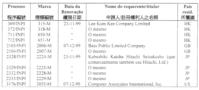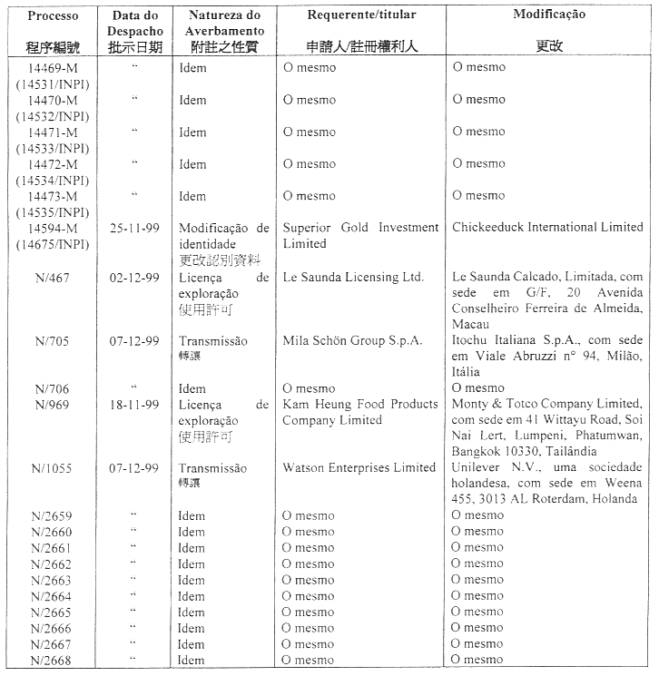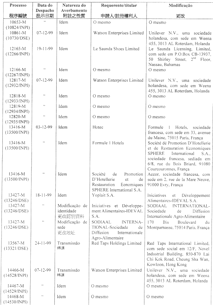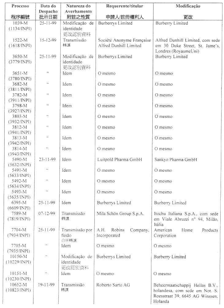 商標編號N/15 479-M及N/850— 在附註轉讓表之“附註之性 質”;“申請人/註冊權利人”及“更改”欄目內,原文為: “...Lic. Exp....R.J. Reynolds Tobacco Company...Japan Tobacco, Inc., com sede social em 2-2-1 Toranomon, Minato-ku, Tokyo, Japão...” 應改為:“...Transmissão...Kwong Kee Pen Company Limited...Zebra Company Limited, sociedade japonesa com sede em 2-9 Higashigokencho, Shinjuku-ku, Tokyo, Japão...”。