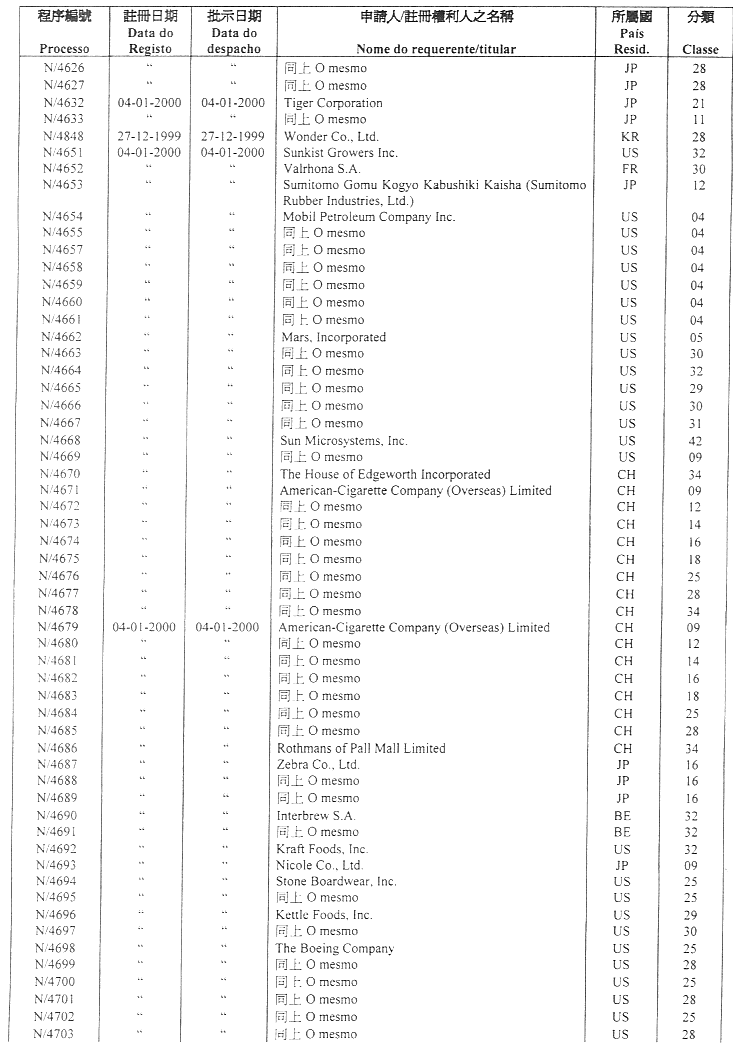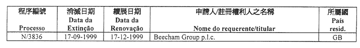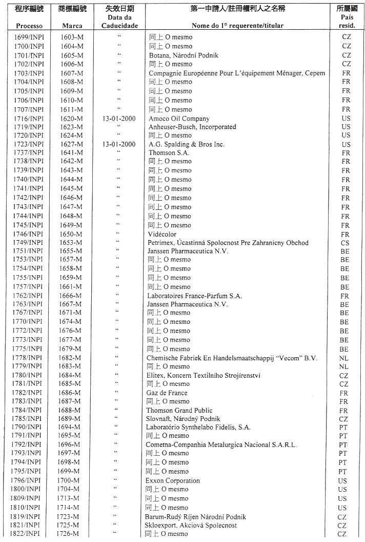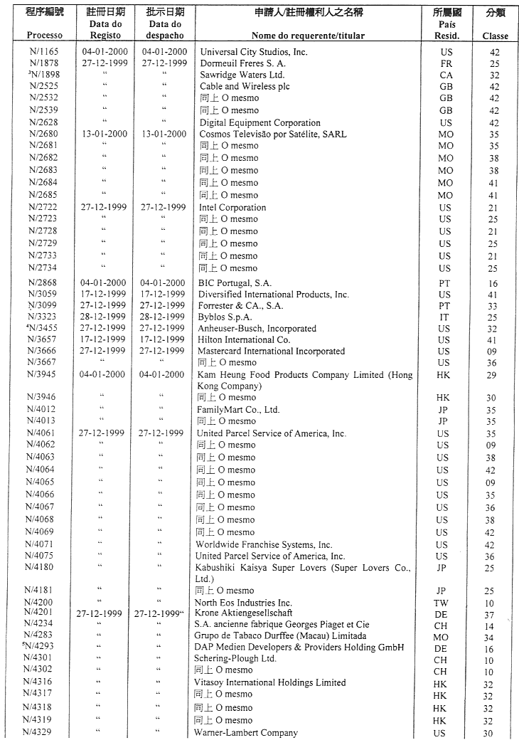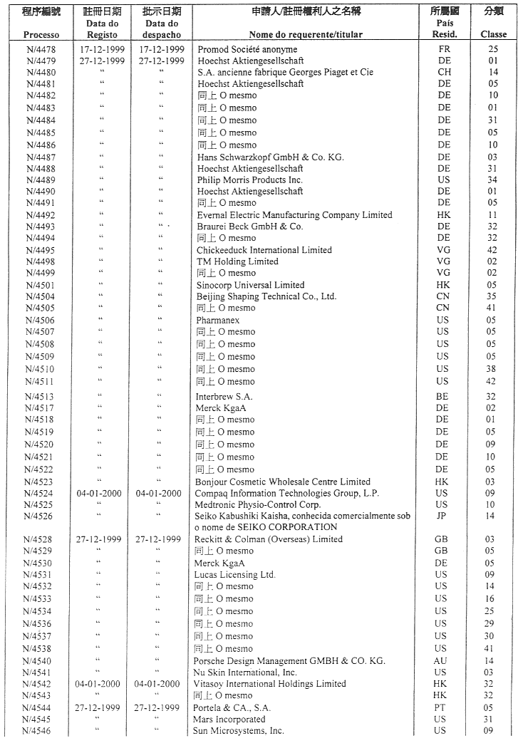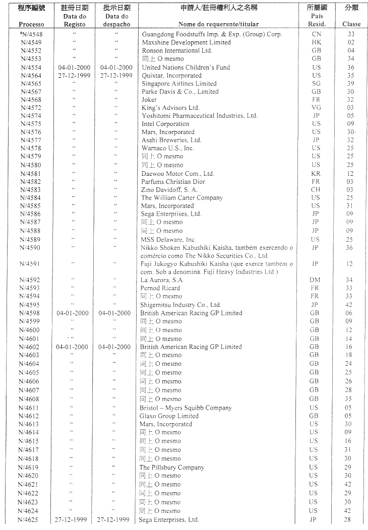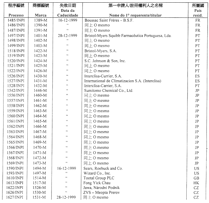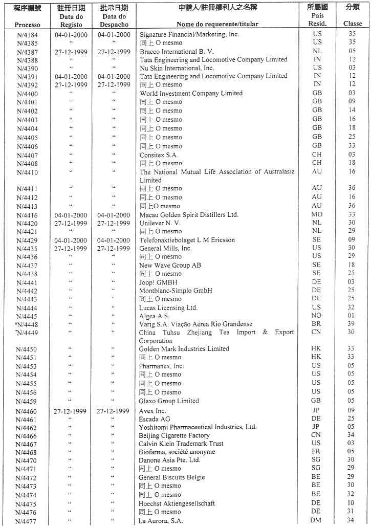 根據刊登於一九九九年六月二日第二十二期第二組《政府公報》內,由經濟司與葡國國家工業產權署根據一九九九年一月十二日議定書訂立的合作計劃,茲公佈自以下日期獲批准之專利權: