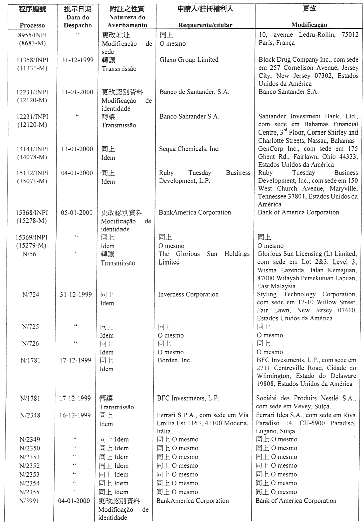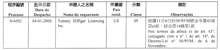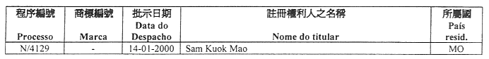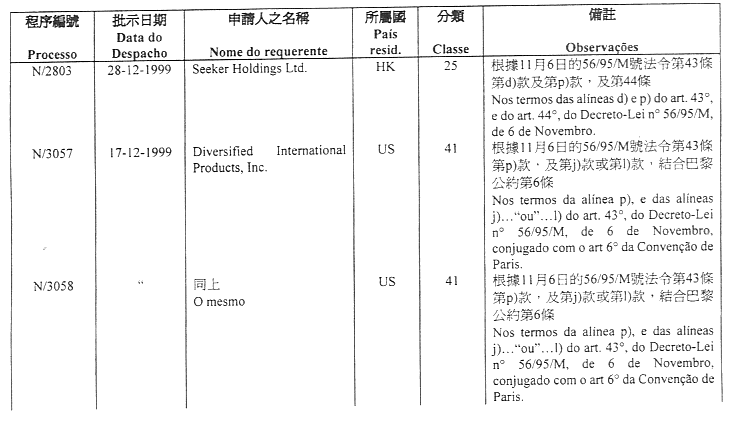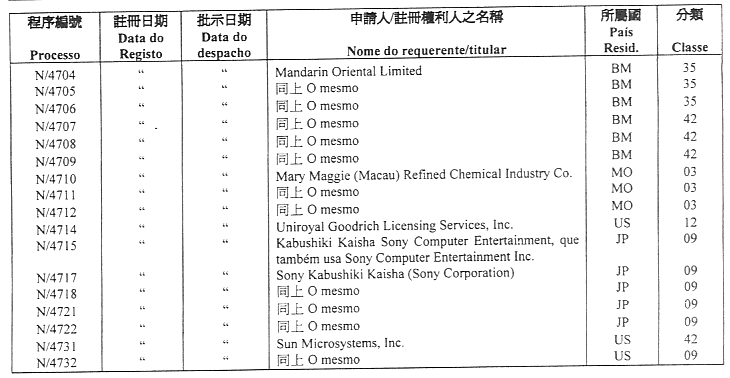 根據十一月六日第56/95/M號法令第十六條及第三十三條,以下公布本地區商標註冊之請求書,並按照相同法規第三十條及第三十四條,由通告公布日期開始計算三十日期限內,得提出產品及服務分類之聲明異議,及任何人認為倘給予註冊將對其造成損害得由通告公布日期開始計算九十日期限內提出聲明異議。