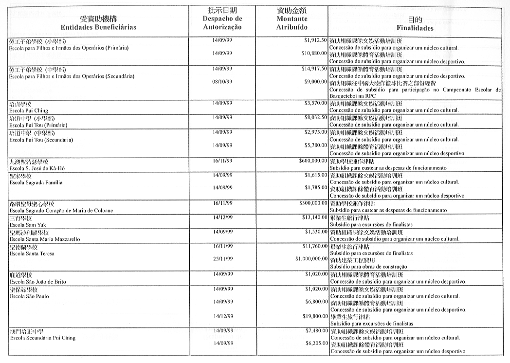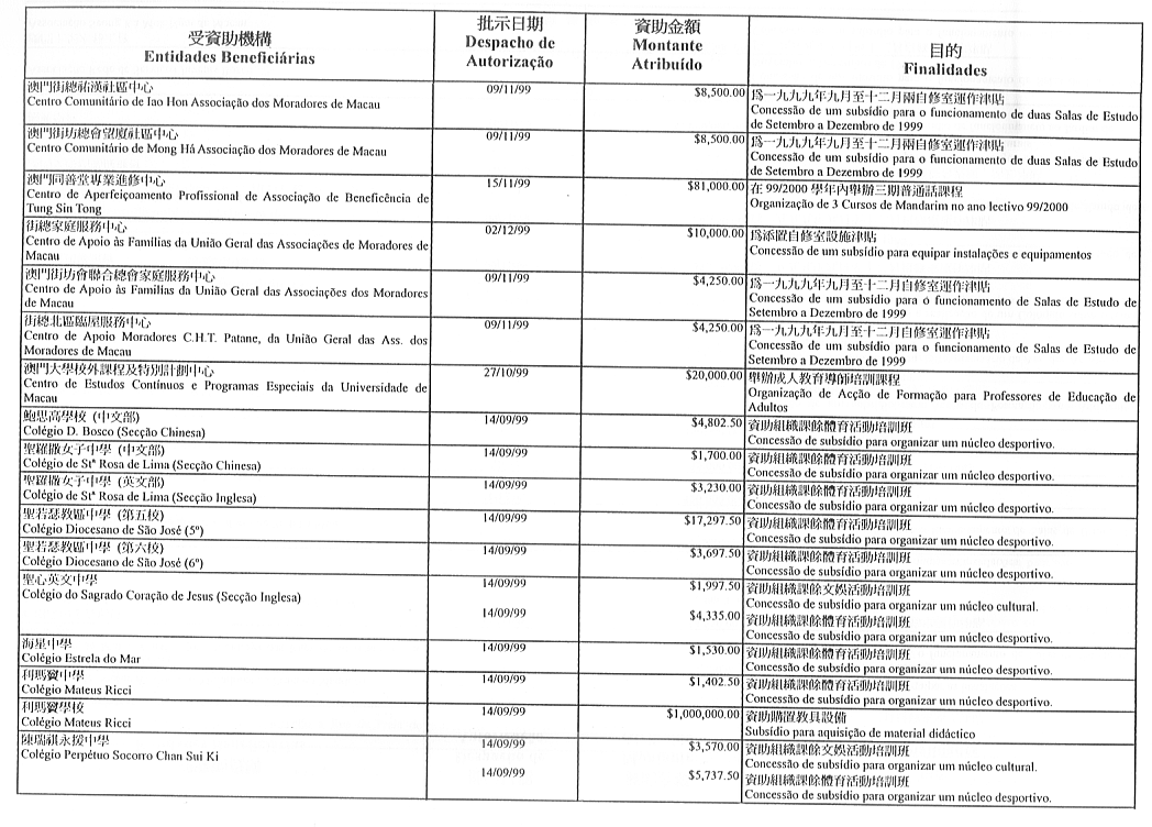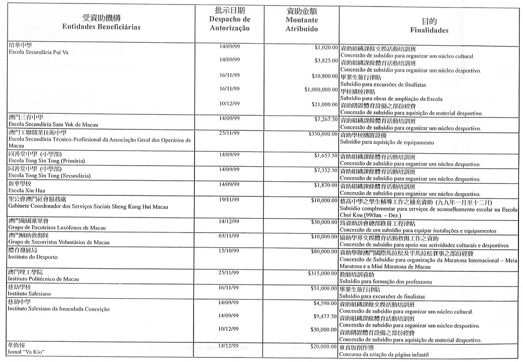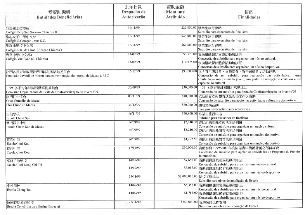 為履行關於給予私人及私人機構的財政資助八月二十六日第54/GM/97號批示,教育暨青年局現公佈一九九九年度第四季財政資助表: