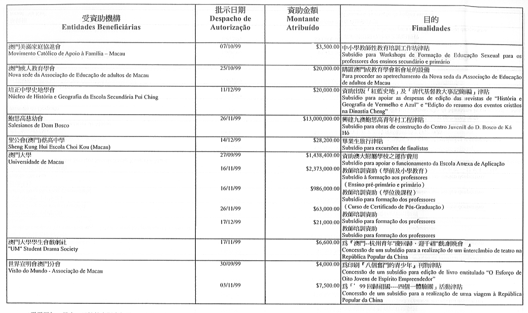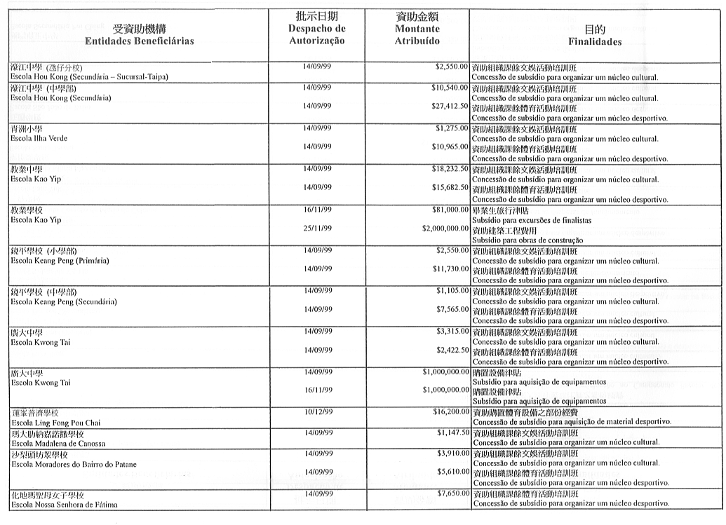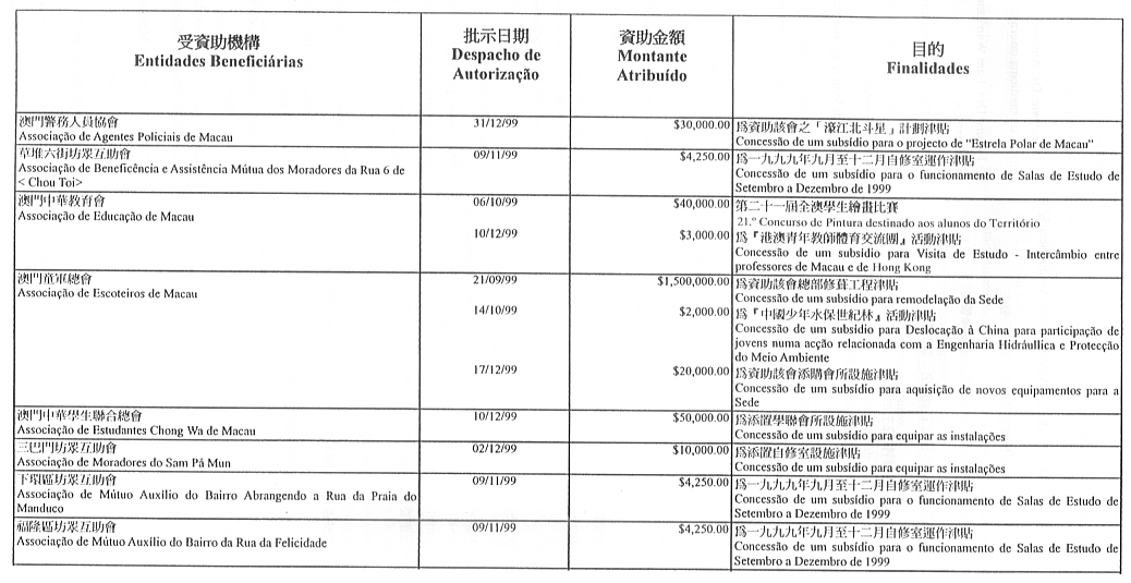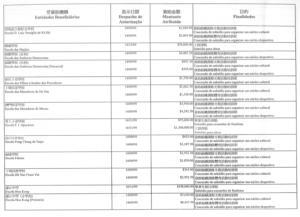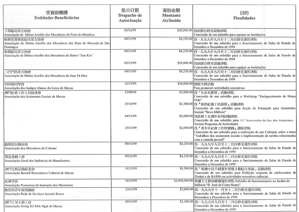 為履行關於給予私人及私人機構的財政資助八月二十六日第54/GM/97號批示,教育暨青年局現公佈一九九九年度第四季財政資助表: