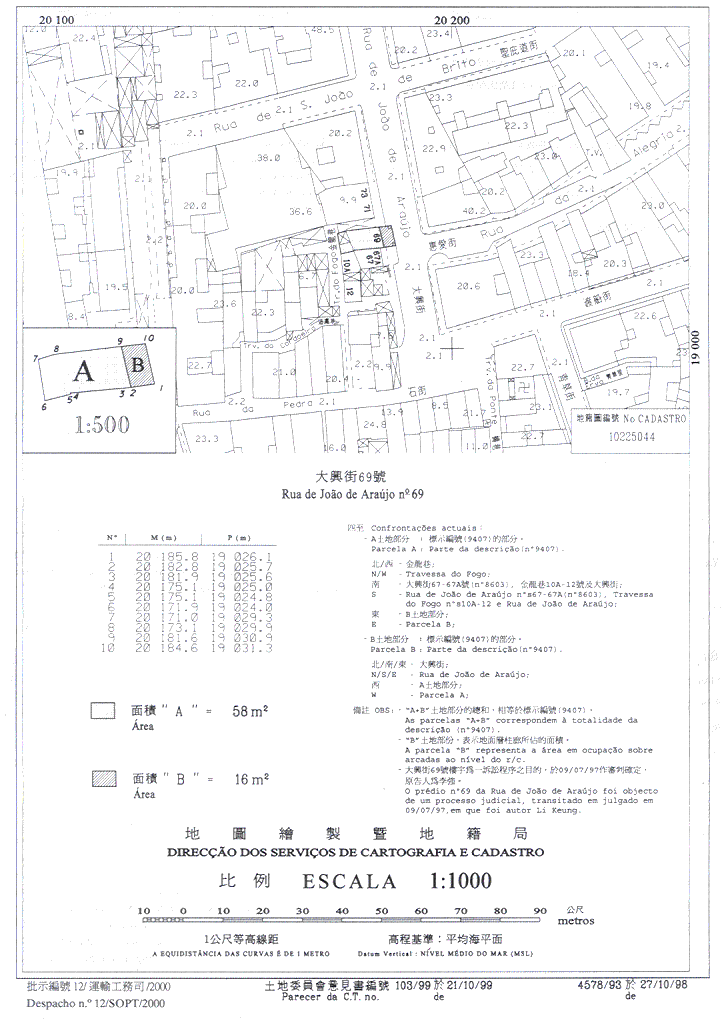 三、上述都巿樓宇標示於物業登記局B-26B冊第188頁第9407號,而利用權以申請人的名義在第17162F號作臨時登記,並在前地圖繪製暨地籍司於一九九八年十月二十七日發出的第4578/93號地籍圖中以字母 “A”及“B”標示。