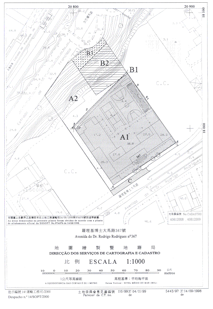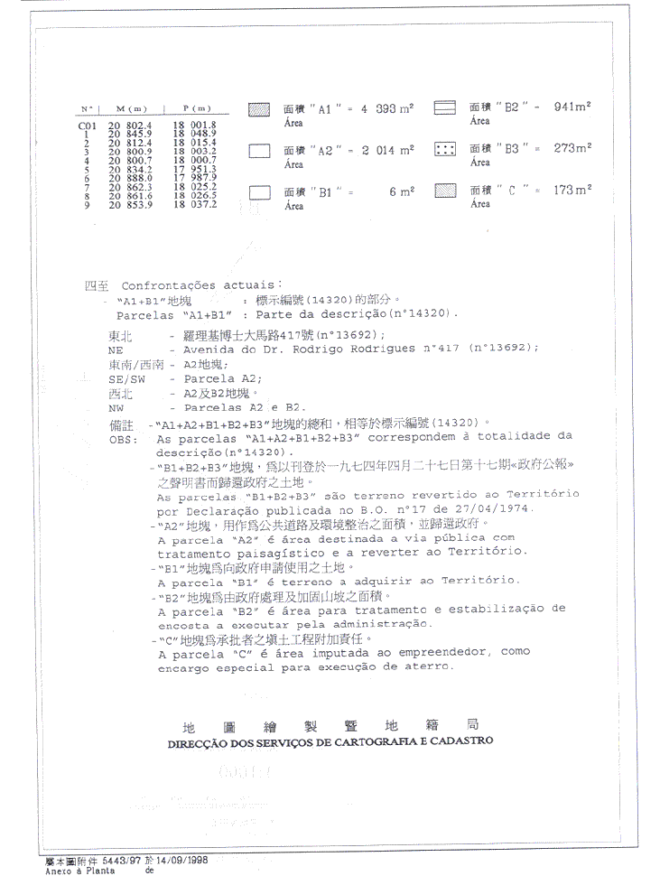 十四、歸還給澳門特別行政區的土地標示於物業登記局B50冊第29頁第21466號及以承批公司的名義登記於F11冊第10525號。在前地圖繪製暨地籍司於一九九七年五月二十二日發出的第799/89號地籍圖中以字母C及C1標示的地皮用作納入私產範圍,而以字母B標示的地皮則用作納入公產範圍。