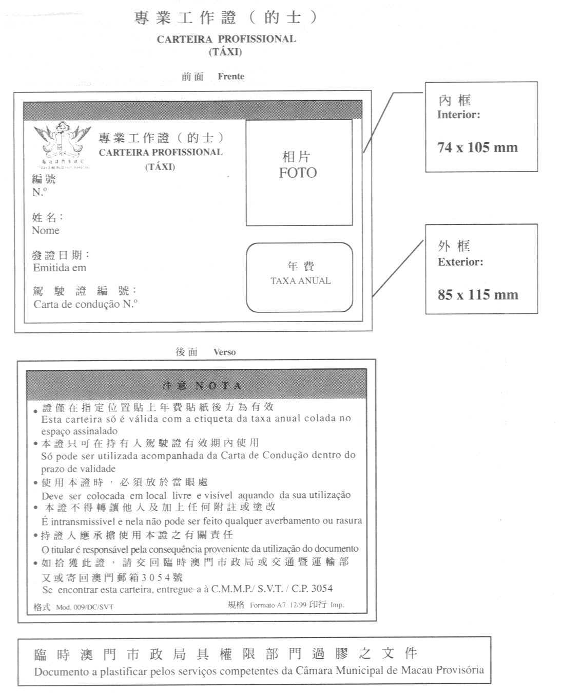 茲重新刊登臨時澳門市政局透過二零零零年二月二十三日第八期《澳門特別行政區公報》第二組內之通告刊登之的士駕駛員專業工作證式樣。