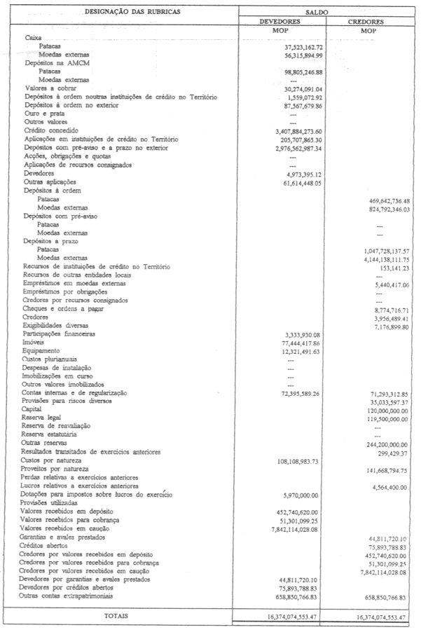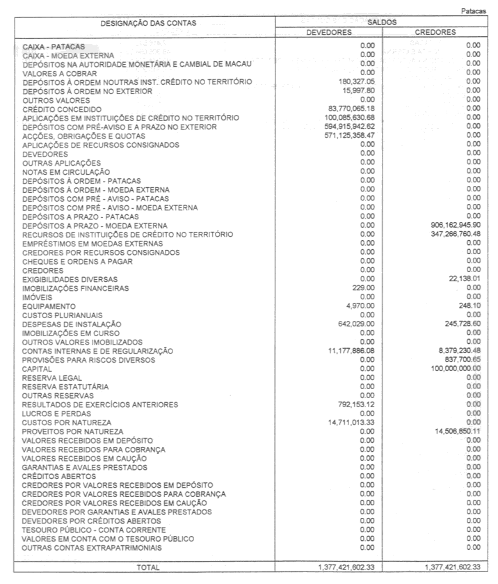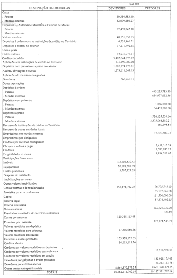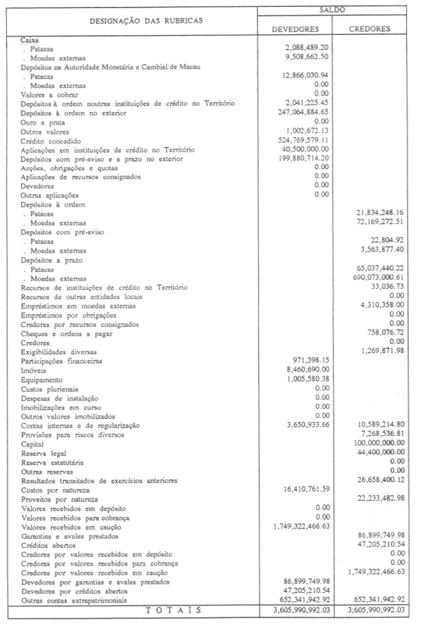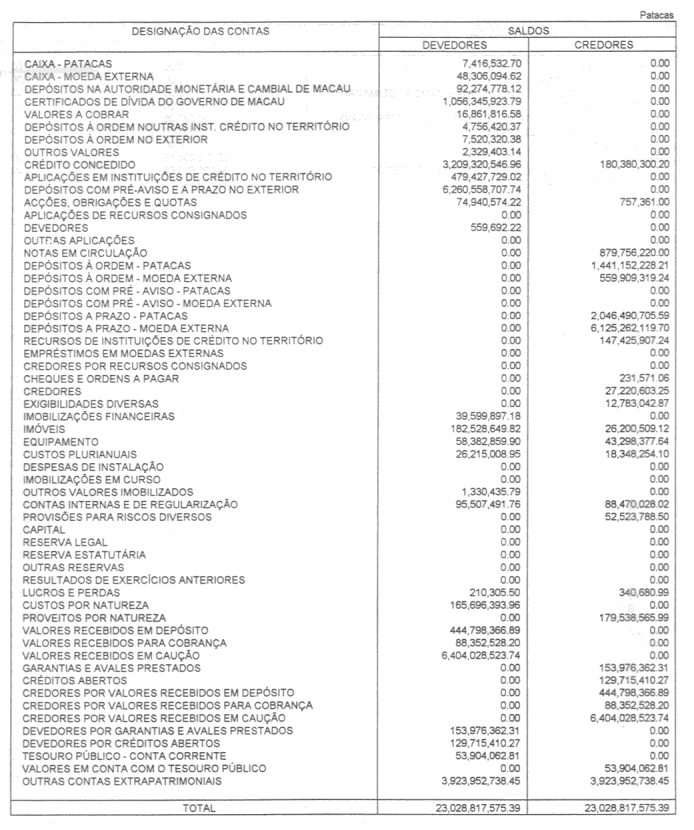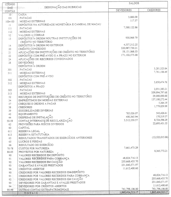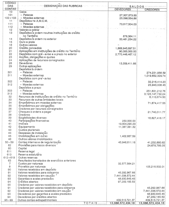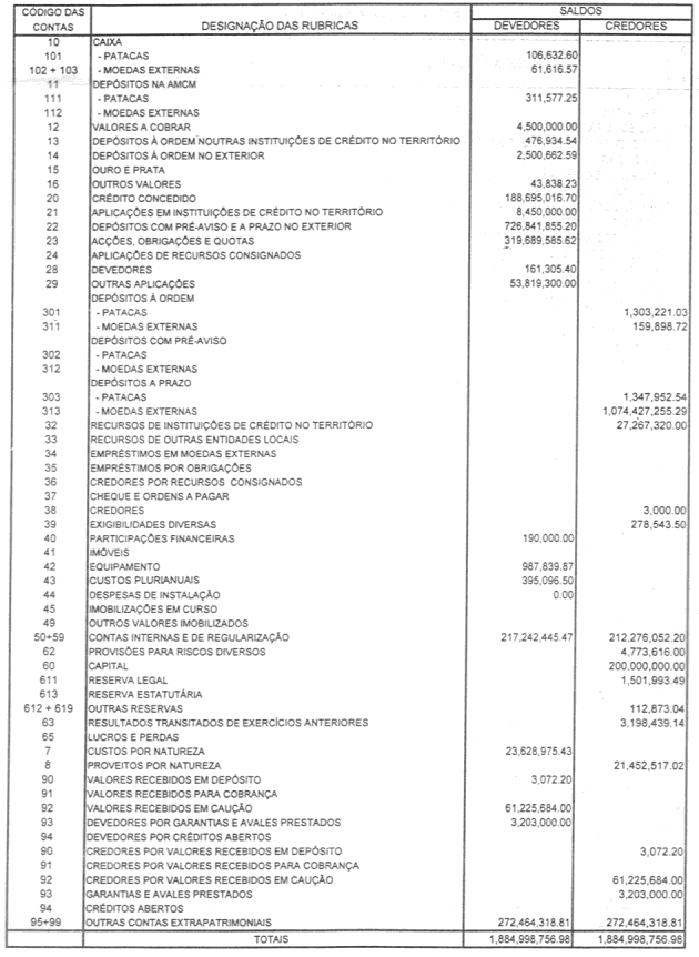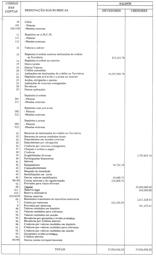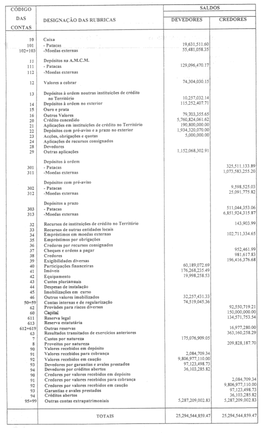 | Código | Designação das Contas | Saldo Devedor | Saldo Credor |