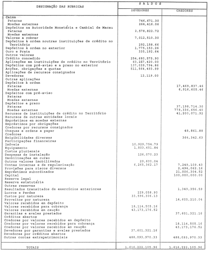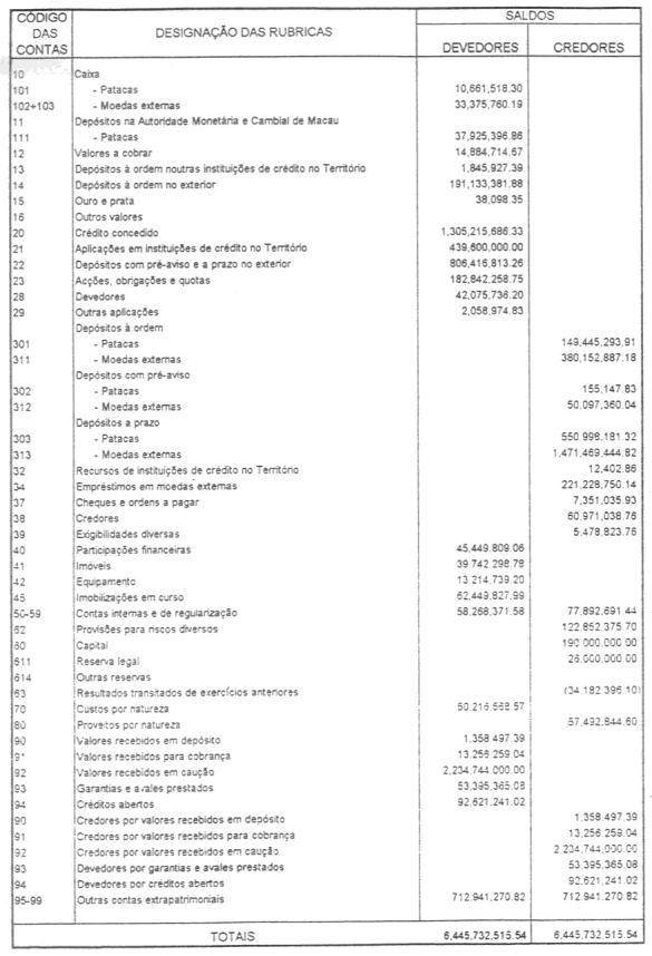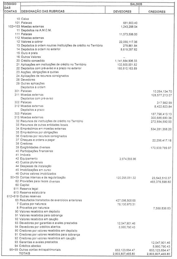 | Código | Designação das Contas | Saldo Devedor | Saldo Credor |