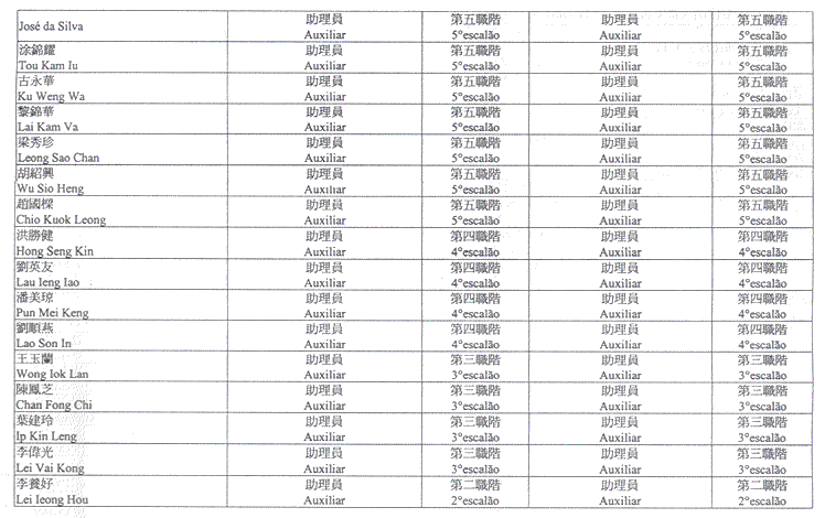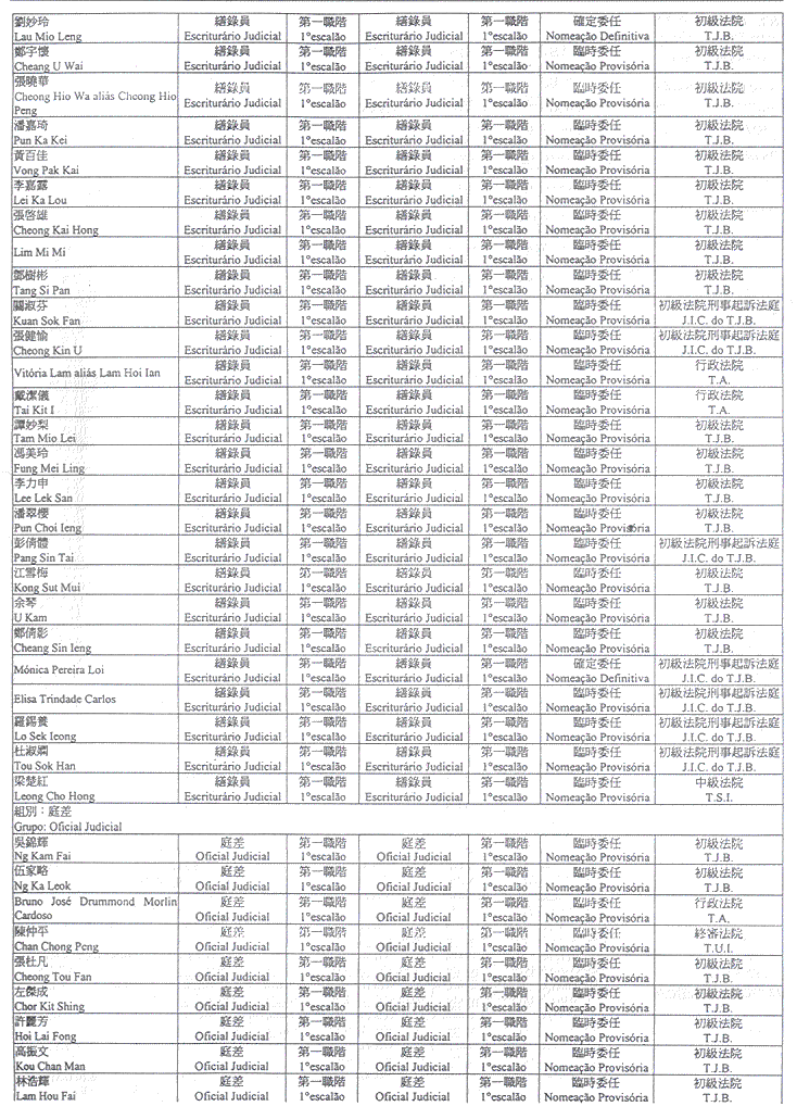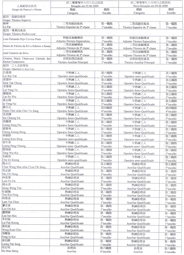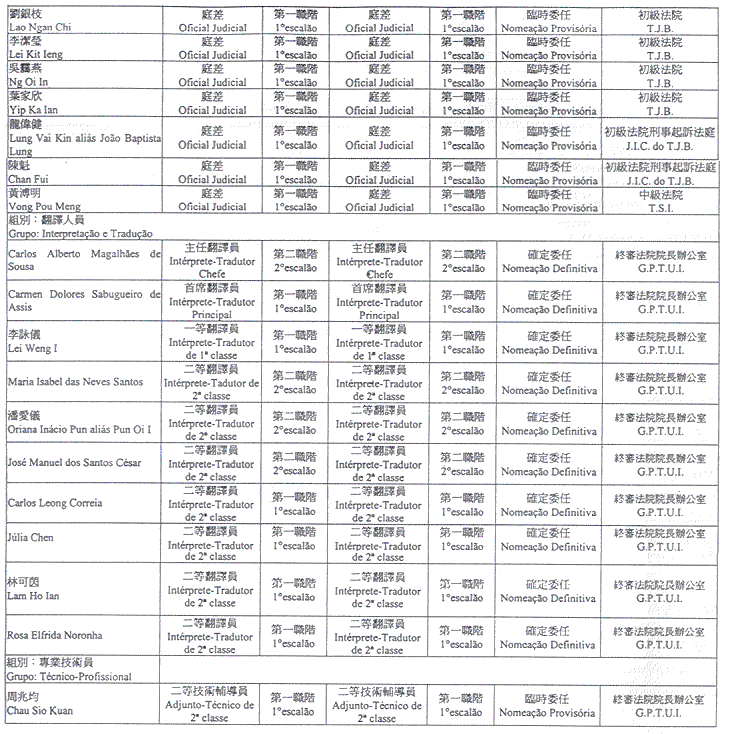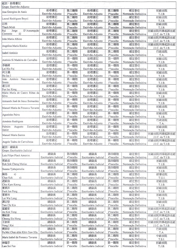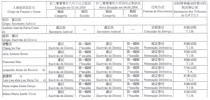 根據二零零零年三月六日《澳門特別行政區公報》第十期第一組 第19/2000號行政法規《終審法院院長辦公室組織和運作》第二十八條第一及第二款的規定,並根據八月四日第7/97/M號法律、十一月二十八日第52/97/M號法令和第53/97/M號法令,任職於各級法院辦事處的司法輔助人員及原在上述法院辦事處任職的,屬司法事務局編制內或外以合同方式提供服務的人員,自二零零零年六月四日起轉入各級法院辦事處或終審法院院長辦公室人員名單: