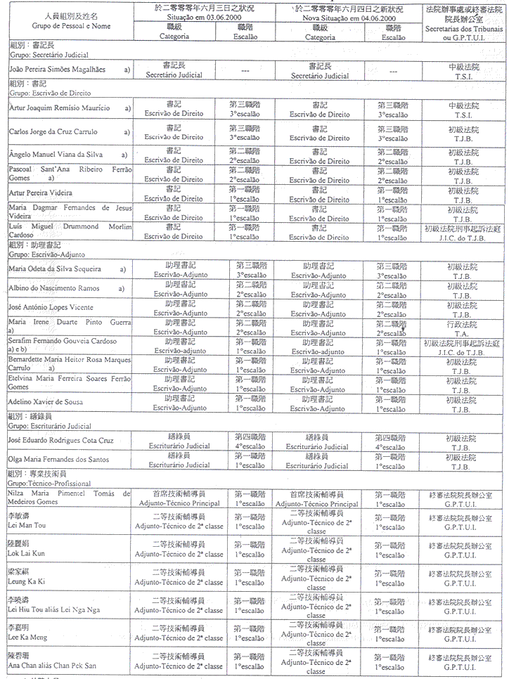根據八月四日第7/97/M號法律、十一月二十八日第52/97/M號法令和第53/97/M號法令,任職於各級法院辦事處的司法輔助人員及原在上述法院辦事處任職的,屬司法事務局編制內或外以合同方式提供服務的人員,自二零零零年六月四日起以相同之職程、職級、職階及任用方式,分別轉入各級法院辦事處或終審法院院長辦公室,人員名單見附表。