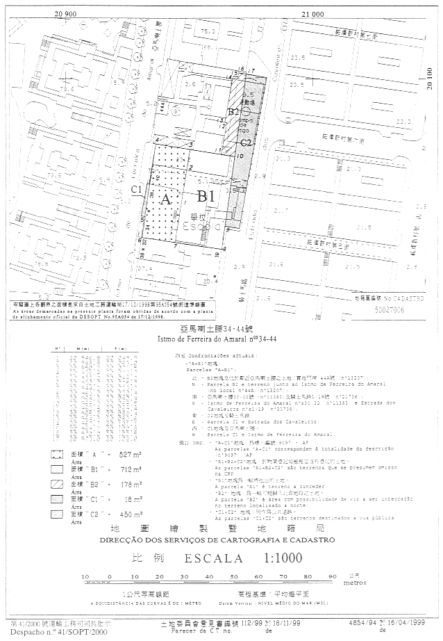 1.2) 將上項所指面積為527平方米及價值澳門幣527,000.00元的土地以租賃方式批給乙方,該土地在前地圖繪製暨地籍司於一九九九年四月十六日發出的第4584/94號地籍圖中以字母“A”標示。根據新街道準線圖的規定,在上述地籍圖中以字母“ C1”標示的該土地餘下部分面積為18平方米,其將納入公共街道。
