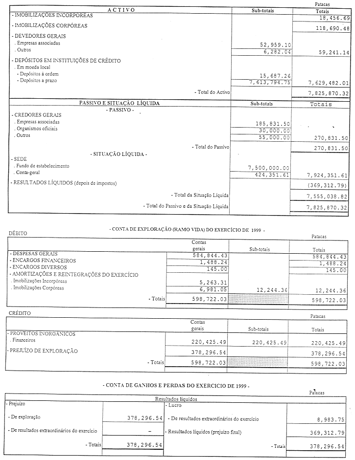 Na nossa opinião as demonstrações financeiras apresentam de forma verdadeira e apropriada a situação financeira da Sucursal em 31 de Dezembro de 1999, bem como os resultados do período de 22 de Março de 1999 (data do início da actividade) a 31 de Dezembro de 1999, e foram preparadas de acordo com o Diploma Regulador da Actividade Seguradora de Macau.