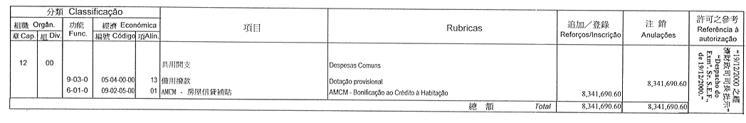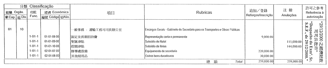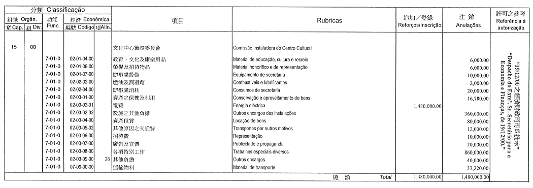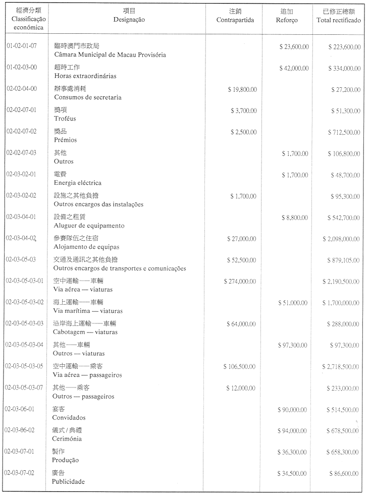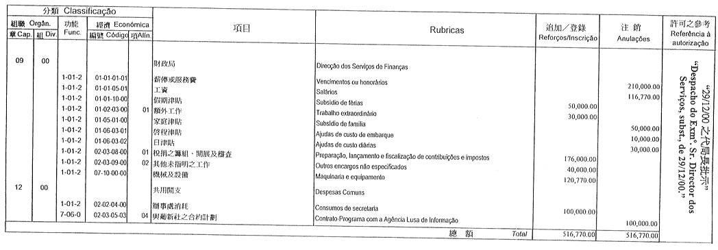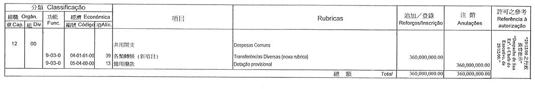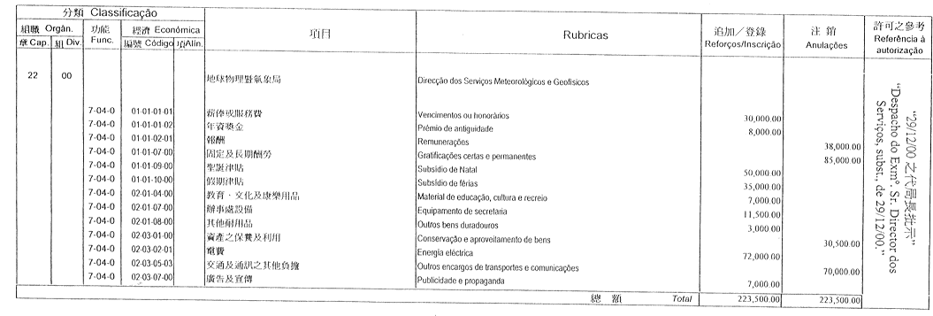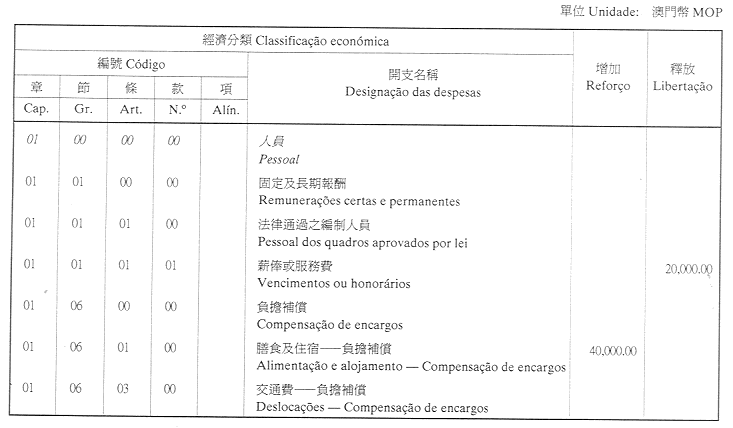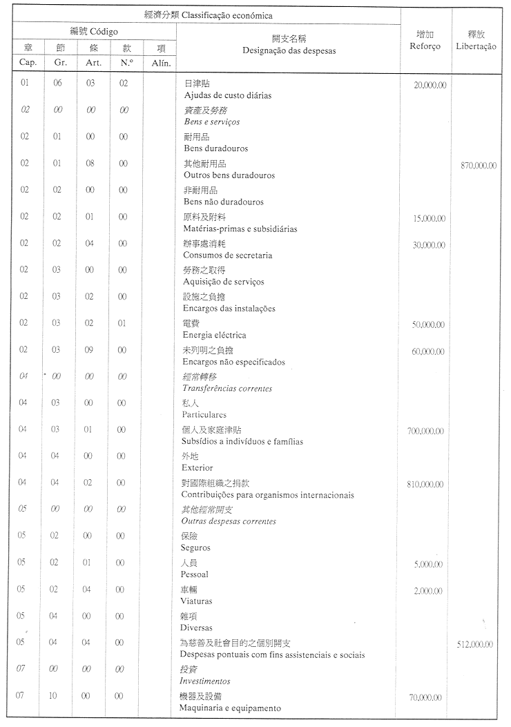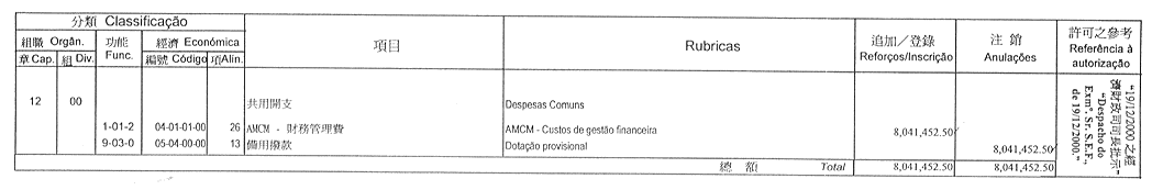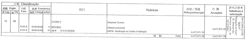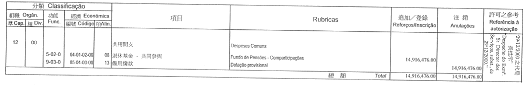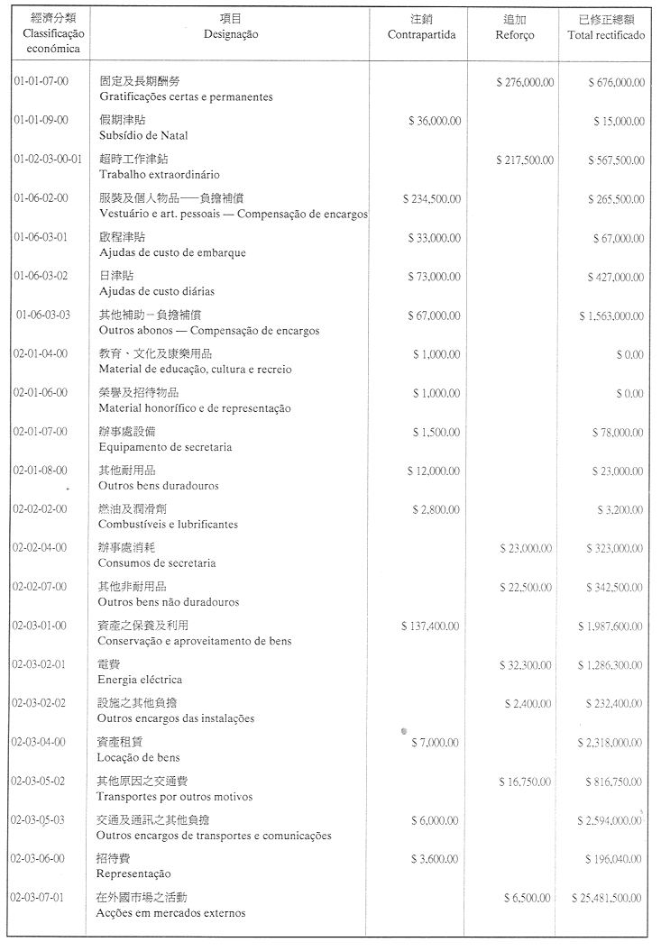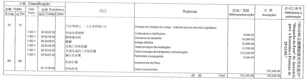根據刊登於《澳門特別行政區公報》第十七期(第二副刊)的四月二十七日第7/2000號法律第十二條規定,對本經濟年度澳門特別行政區財政預算第一章第二組開支功能分類9-03-0經濟分類04-04-00-00-06,項目為“ 經常轉移——外地——澳門特別行政區駐北京辦事處籌設委員會”的整體款項的分配,作出經四月二十七日第22/87/M號法令修訂的十一月二十一日第41/83/M 號法令第二十一條規定所核准的修改,茲公布如下: