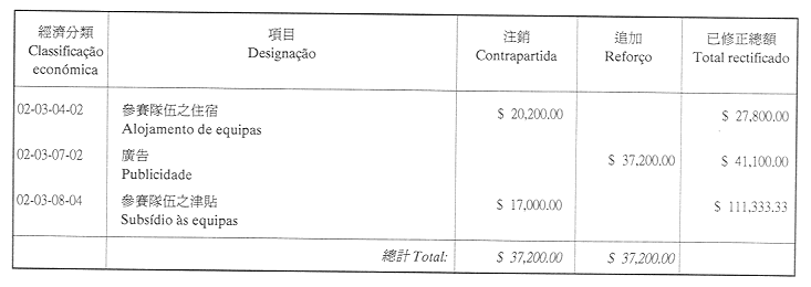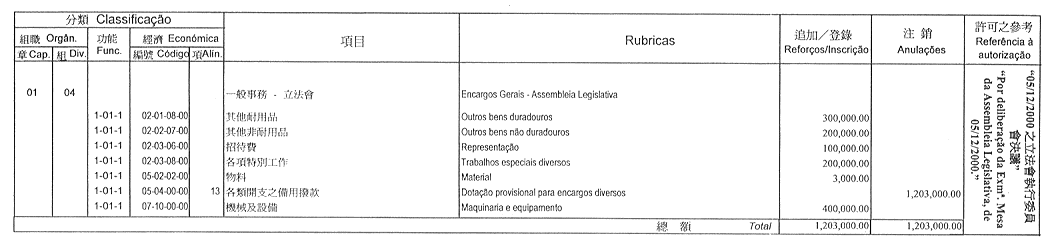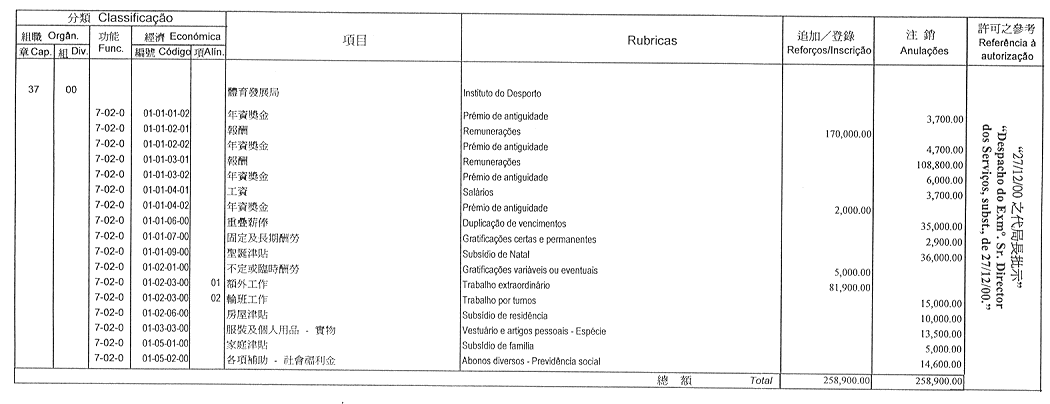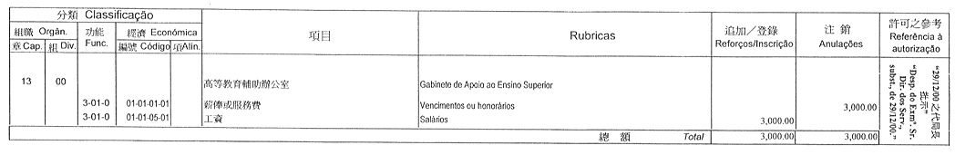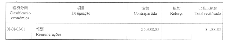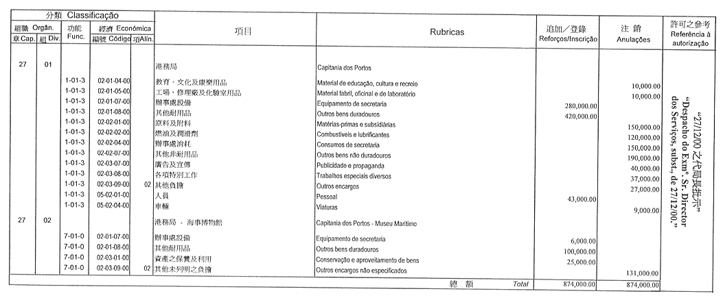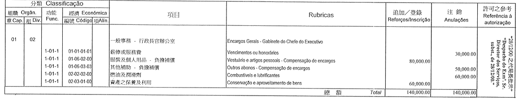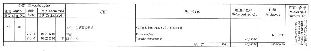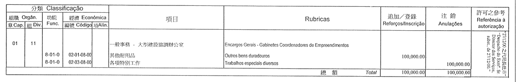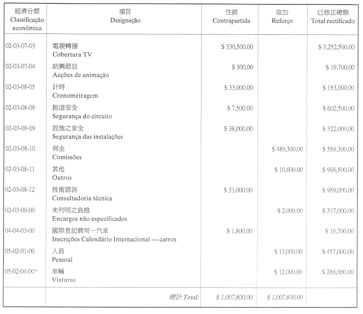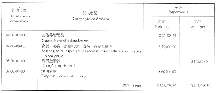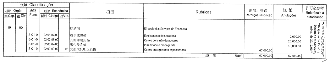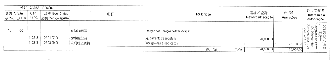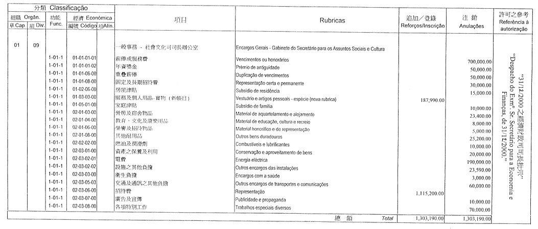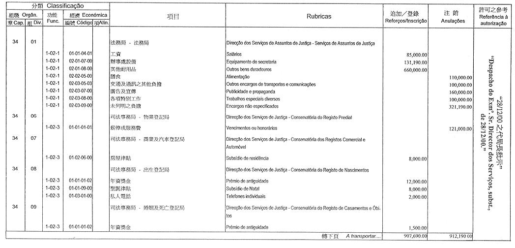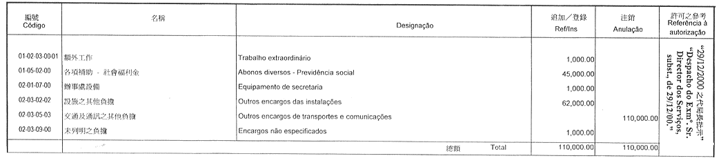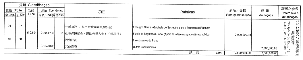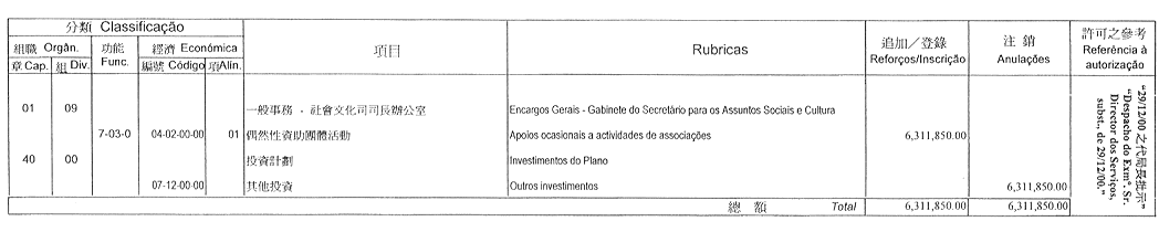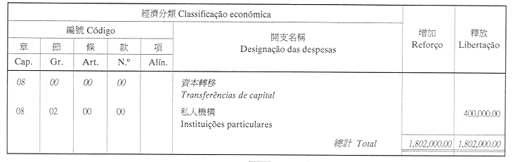 根據刊登於《澳門特別行政區公報》第十七期(第二副刊)的四月二十七日第7/2000號法律第十二條規定,對本經濟年度澳門特別行政區財政預算第一章第二組開支功能分類9-03-0經濟分類04-04-00-00-06,項目為“ 經常轉移——外地——澳門特別行政區駐北京辦事處籌設委員會”的整體款項的分配,作出經四月二十七日第22/87/M號法令修訂的十一月二十一日第41/83/M 號法令第二十一條規定所核准的修改,茲公布如下: