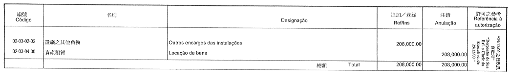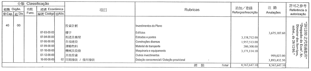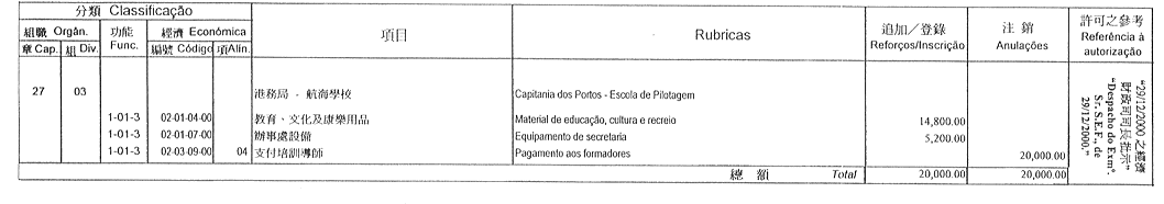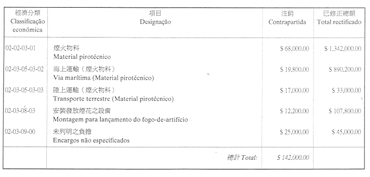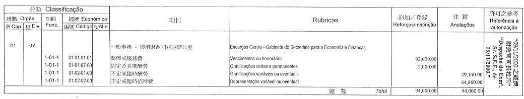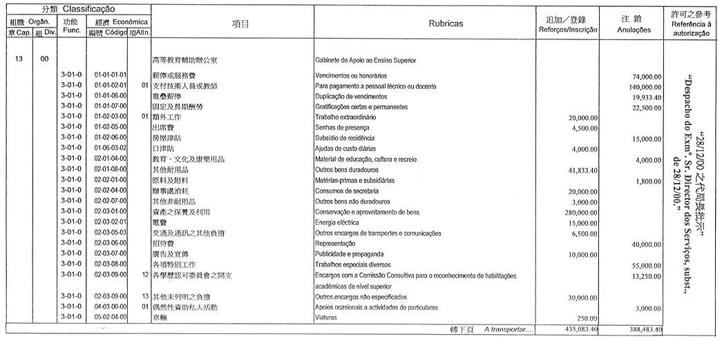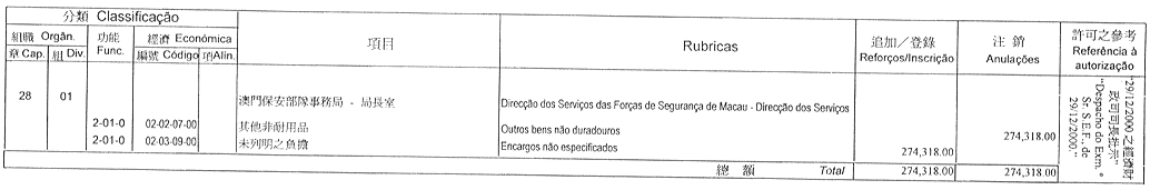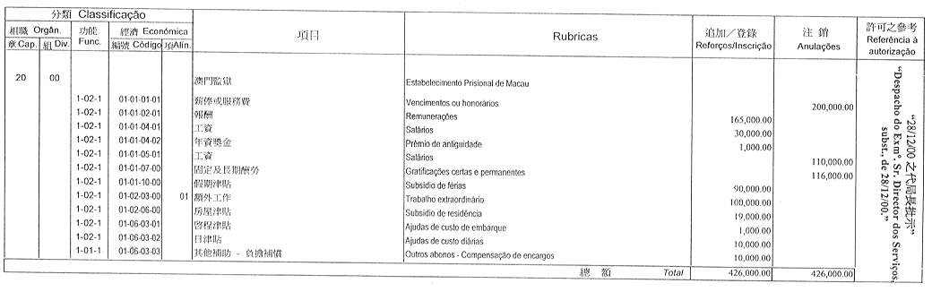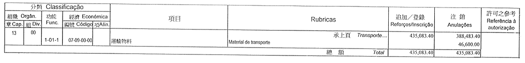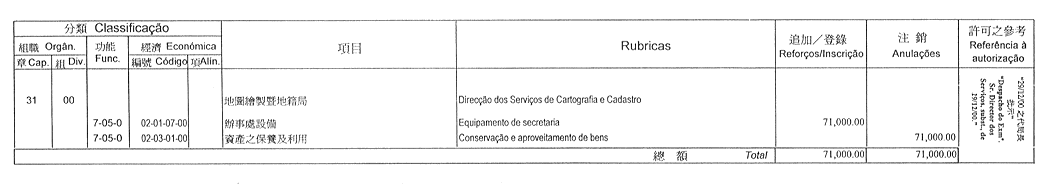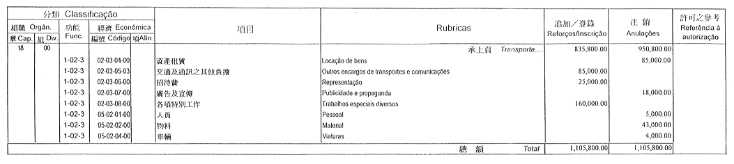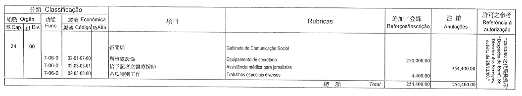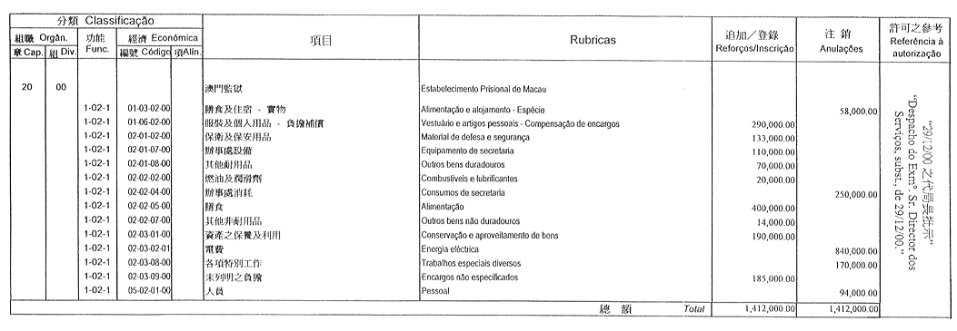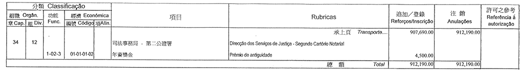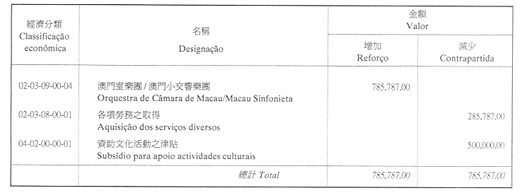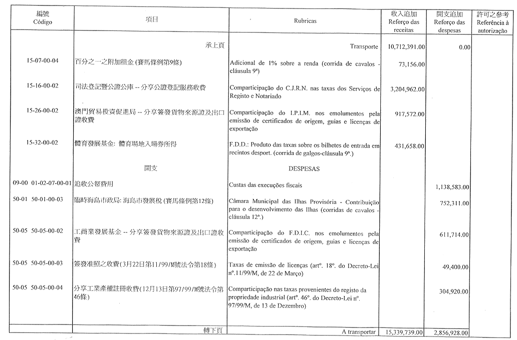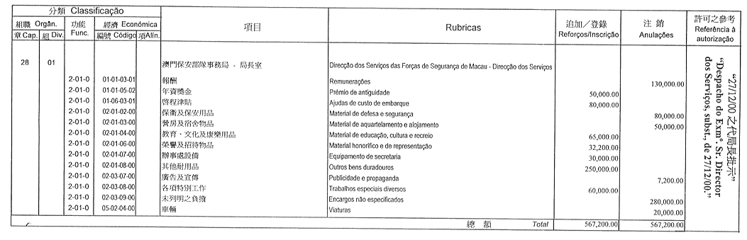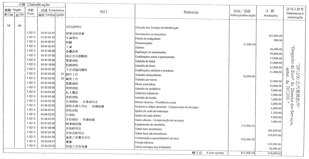 根據刊登於《澳門特別行政區公報》第十七期(第二副刊)的四月二十七日第7/2000號法律第十二條規定,對本經濟年度澳門特別行政區財政預算第一章第二組開支功能分類9-03-0經濟分類04-04-00-00-06,項目為“ 經常轉移——外地——澳門特別行政區駐北京辦事處籌設委員會”的整體款項的分配,作出經四月二十七日第22/87/M號法令修訂的十一月二十一日第41/83/M 號法令第二十一條規定所核准的修改,茲公布如下: