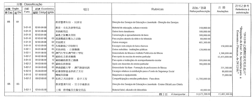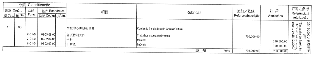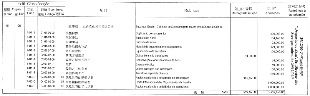 根據九月二十七日第53/93/M號法令第十九條之規定,公布二零零零年財政年度文化基金第五次預算修改,有關修改是經社會文化司司長二零零零年十二月二十九日的批示許可: