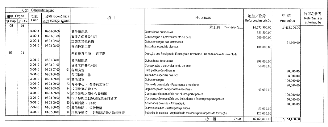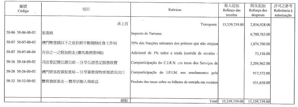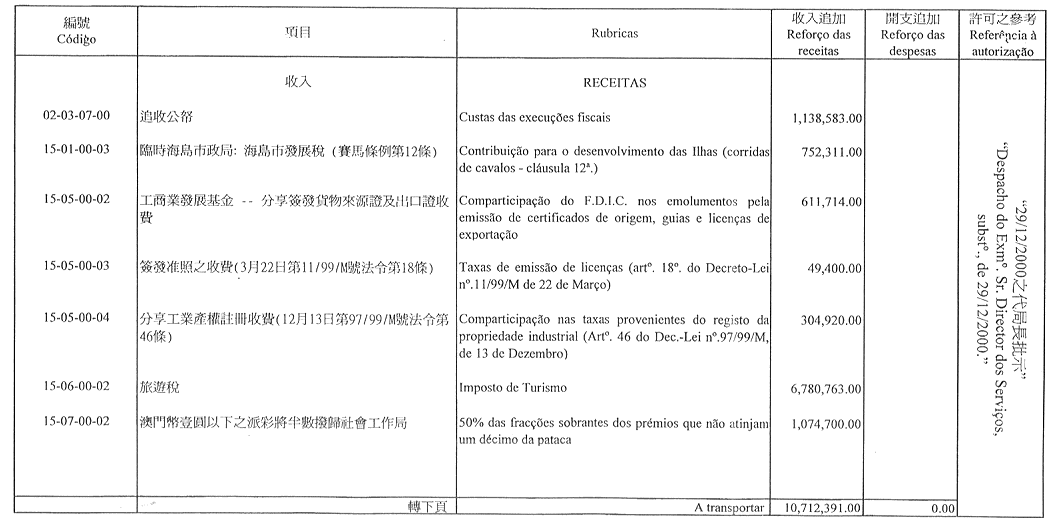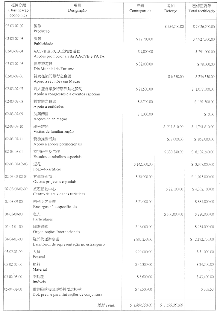 根據九月二十七日第53/93/M號法令第十九條規定,現刊登有關二零零零年度澳門旅遊基金預算之修改,該修改獲社會文化司司長在二零零零年十二月六日及經濟財政司司長在二零零零年十二月二十九日批示核准: