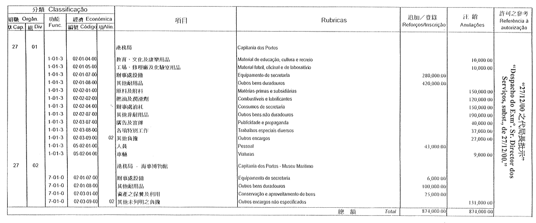 根據九月二十七日第53/93/M號法令第十九條的規定,茲公佈由運輸工務司司長於二零零零年十二月二十九日批示所核准之港務局暨水警稽查局福利會二零零零年度本身預算之修改: