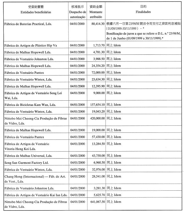 為履行八月二十六日第54/GM/97號批示,有關對私人和私人機構給予財政資助,工商業發展基金現公佈二零零零年第一至第三季度獲津貼的名單: