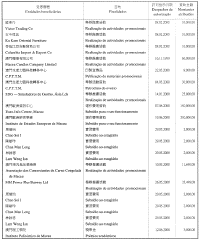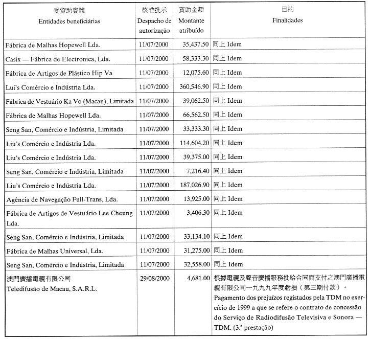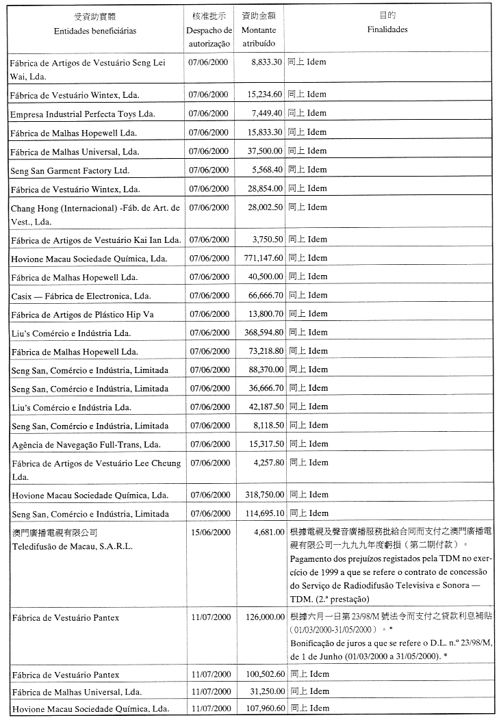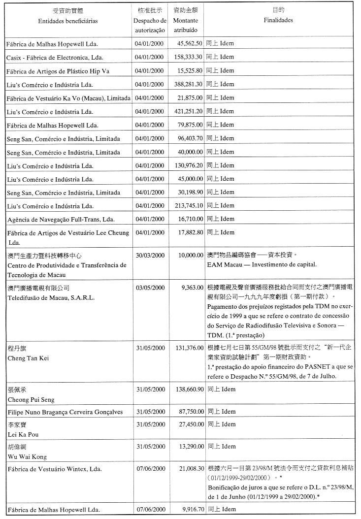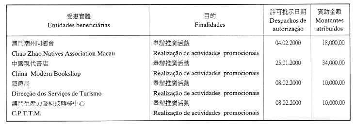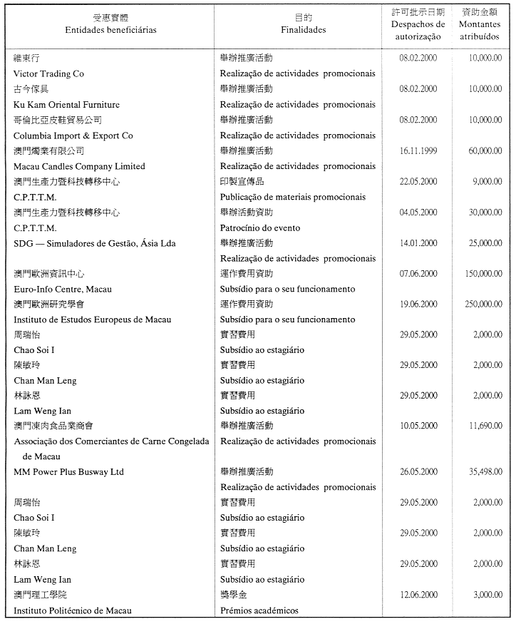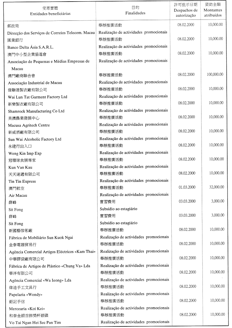 為履行給予私人機構財政資助的八月二十六日第54/GM/97號批示,澳門貿易投資促進局現刊登二零零零年第一季至第三季度受資助的名單: