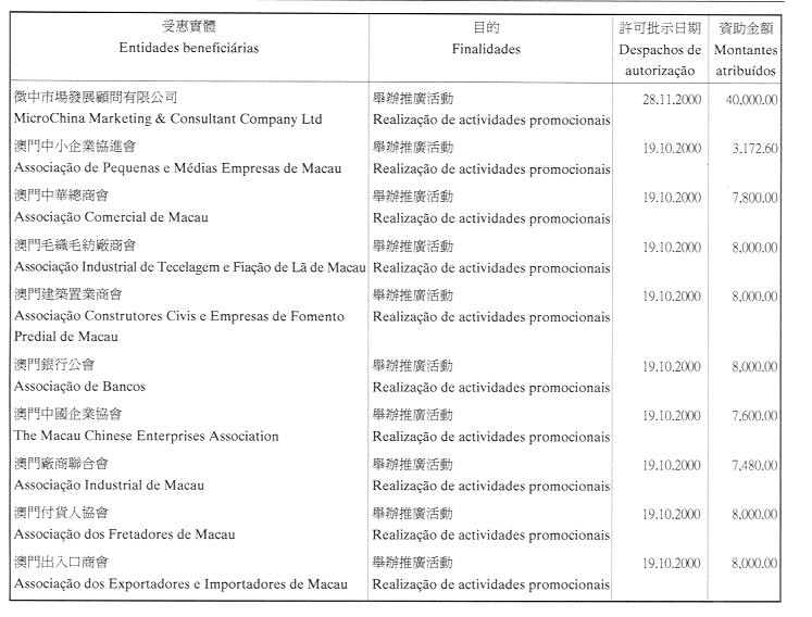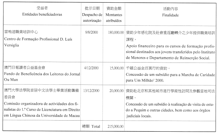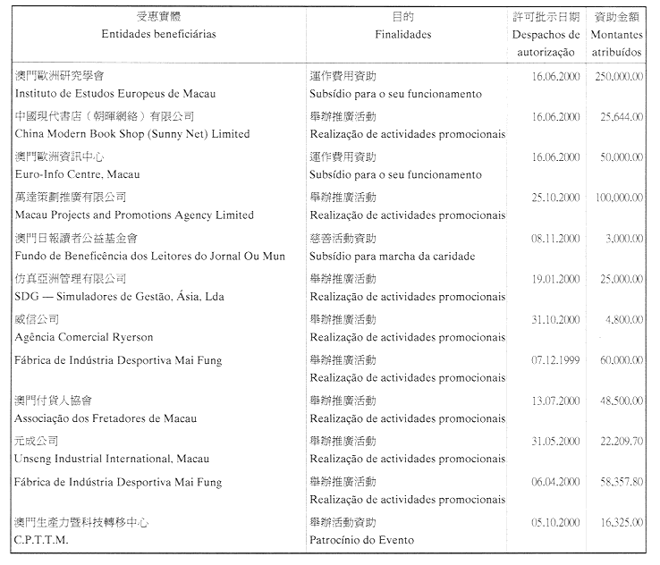 根據八月二十六日第54/GM/97號批示,關於給予私人和私人機構財政資助的有關規定,行政法務司司長辦公室現公佈二零零零年的資助名單: