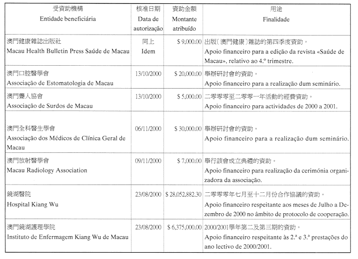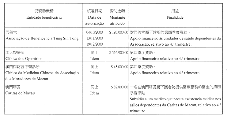 為履行八月二十六日第54/GM/97號,有關於發給個人和私立機構資助的批示,衛生局現公佈二零零零年第四季度獲資助的名單: