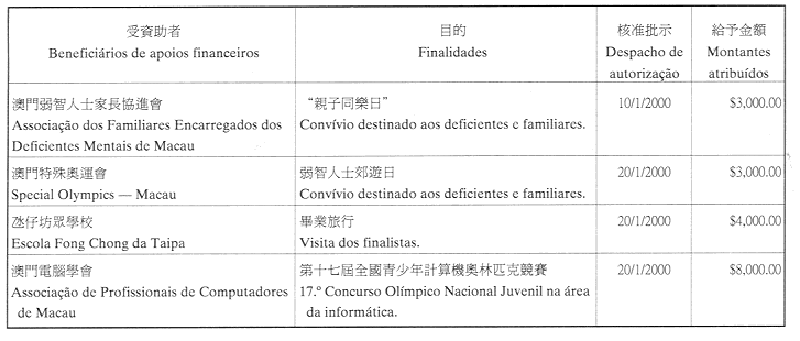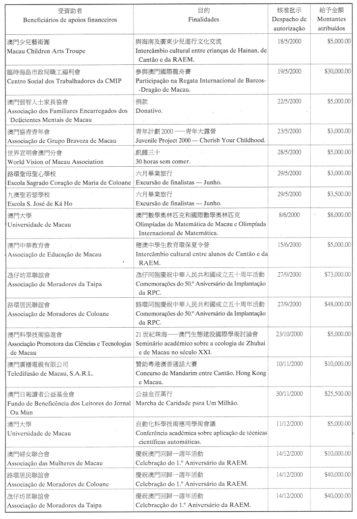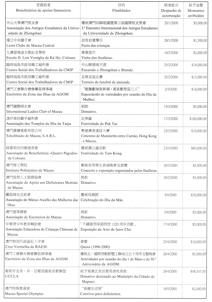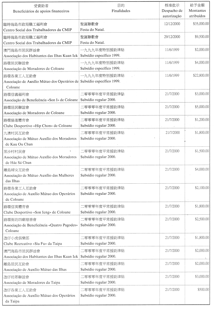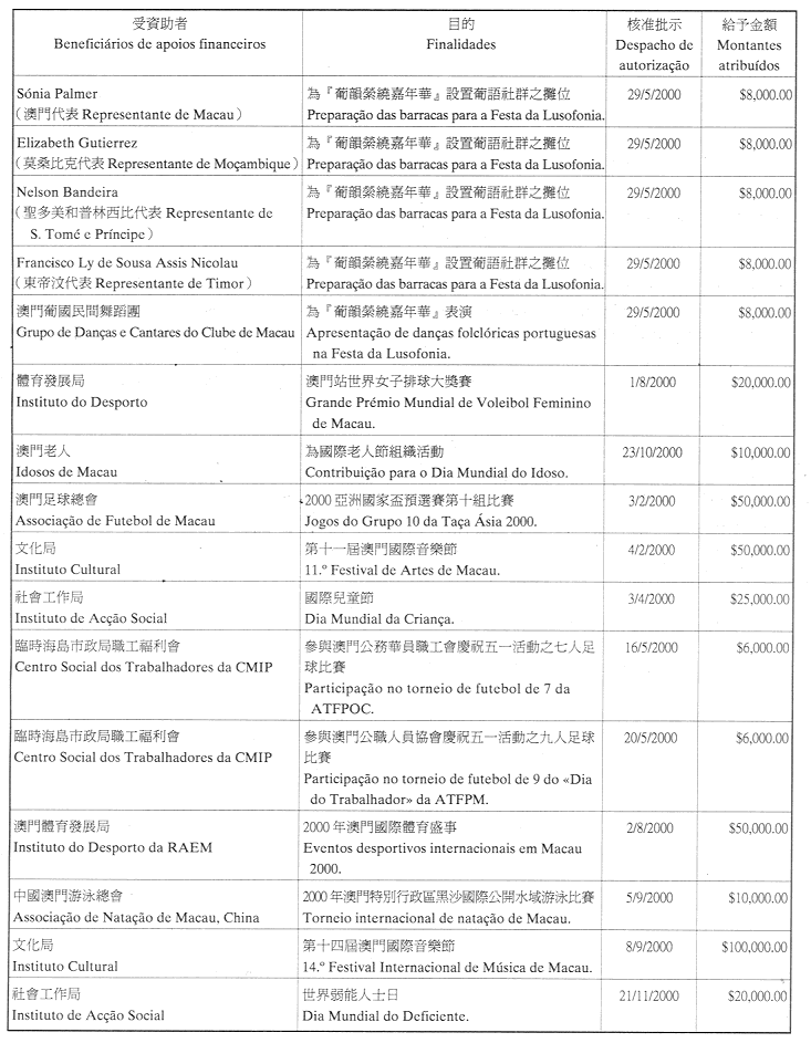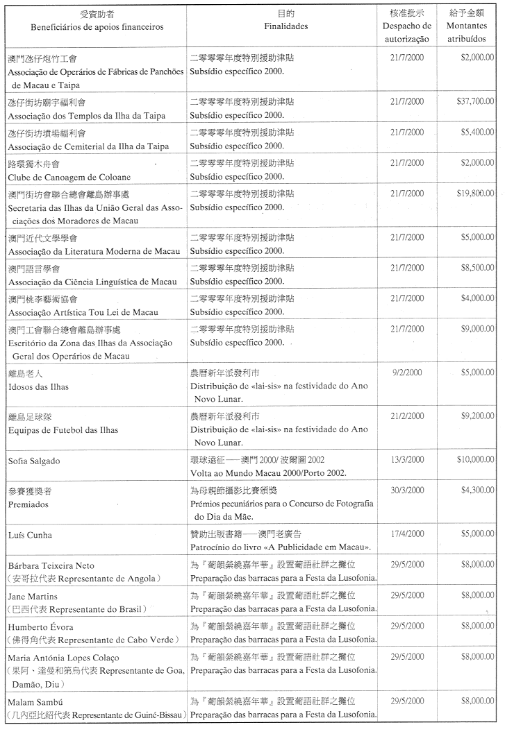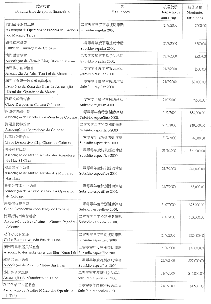 為履行八月二十六日第54/GM/97號,有關對私人及私立實體提供財政資助的批示,臨時海島市政局現公佈二零零零年度獲津貼的名單。