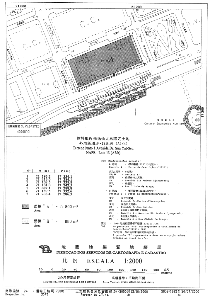 1.透過本合同,批准局部修改一幅面積6,480(陸仟肆佰捌拾)平方米,位於澳門半島外港新填海區(NAPE)第13(A2/h)地段,由柏嘉街、倫斯泰特大馬路、孫逸仙大馬路及宋玉生廣場所圍繞,在地圖繪製暨地籍局(DSCC)於二零零零年七月二十日發出的第3859/92號地籍圖中分別以字母“A”及“B”標示,標示於物業登記局(CRP)第22211號,並在該登記局以乙方的名義於第1465號登記的土地的利用。有關土地之批給受一九九二年七月六日第二十七期《澳門政府公報》公布的第78/SATOP/92號批示所約束。