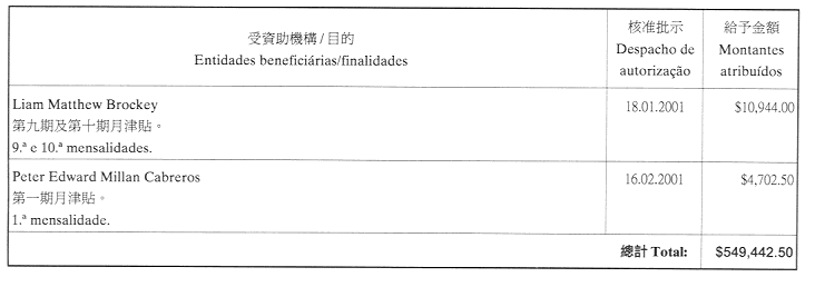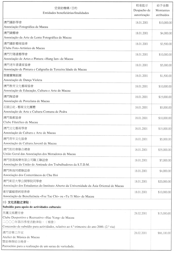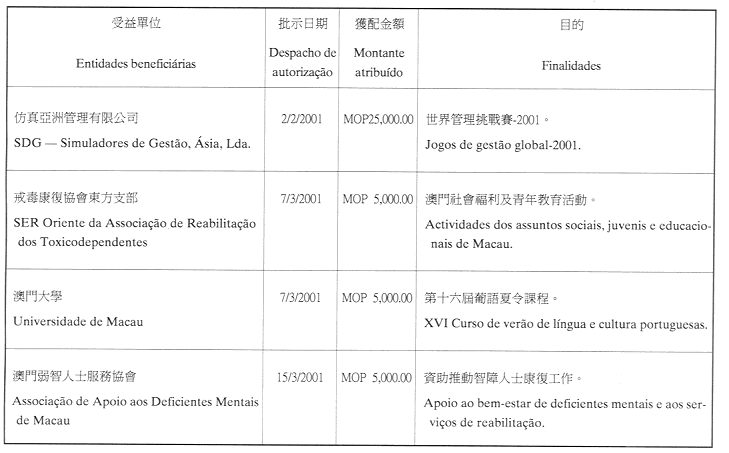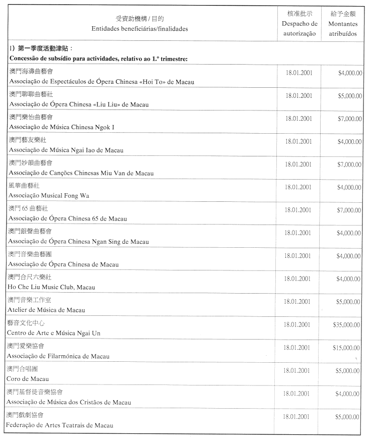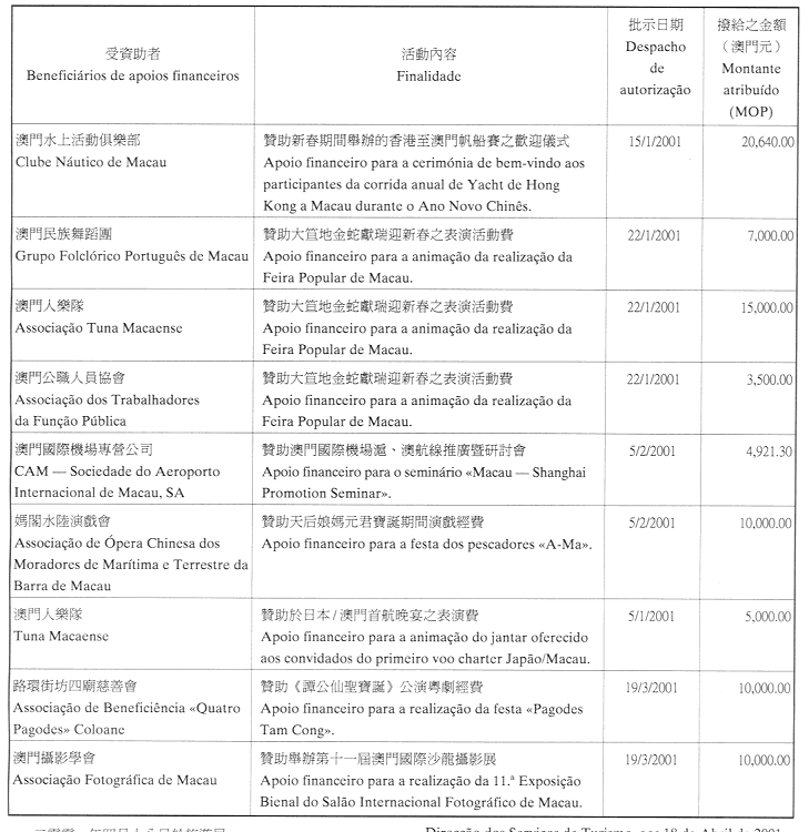 為履行八月二十六日第54/GM/97號關於給予私人及私人機構財政贊助的批示,旅遊基金現公佈二零零一年第一季度之財政贊助表:
