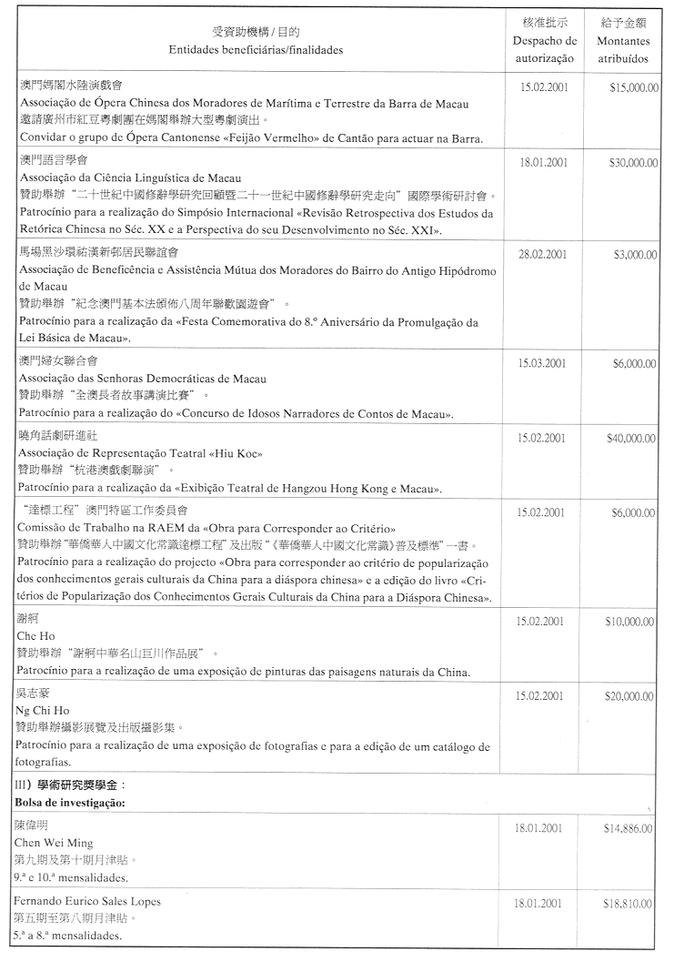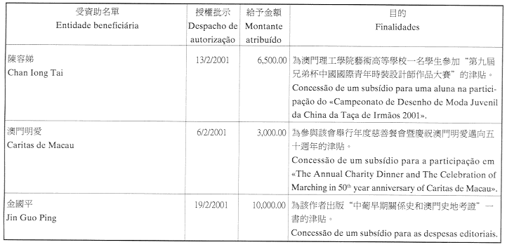 為遵行八月二十六日第54/GM/97號批示,有關撥給私人及私人機構的財政資助,澳門理工學院公佈在二零零一年第一季的資助名單: