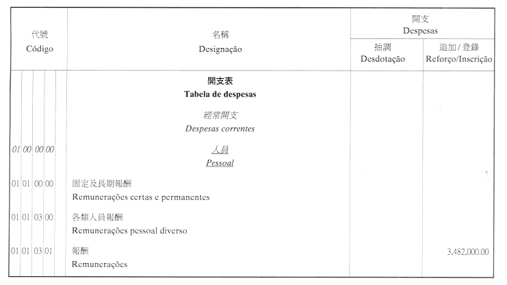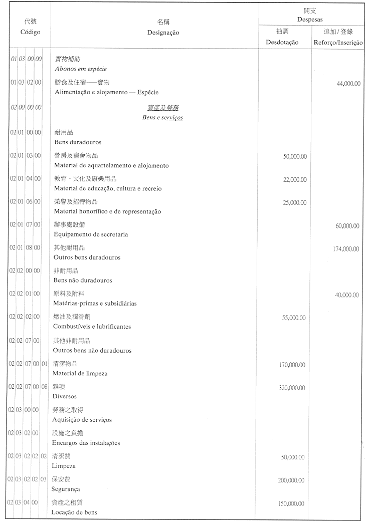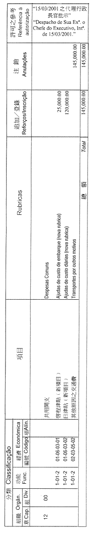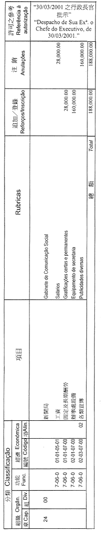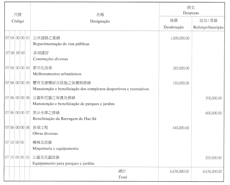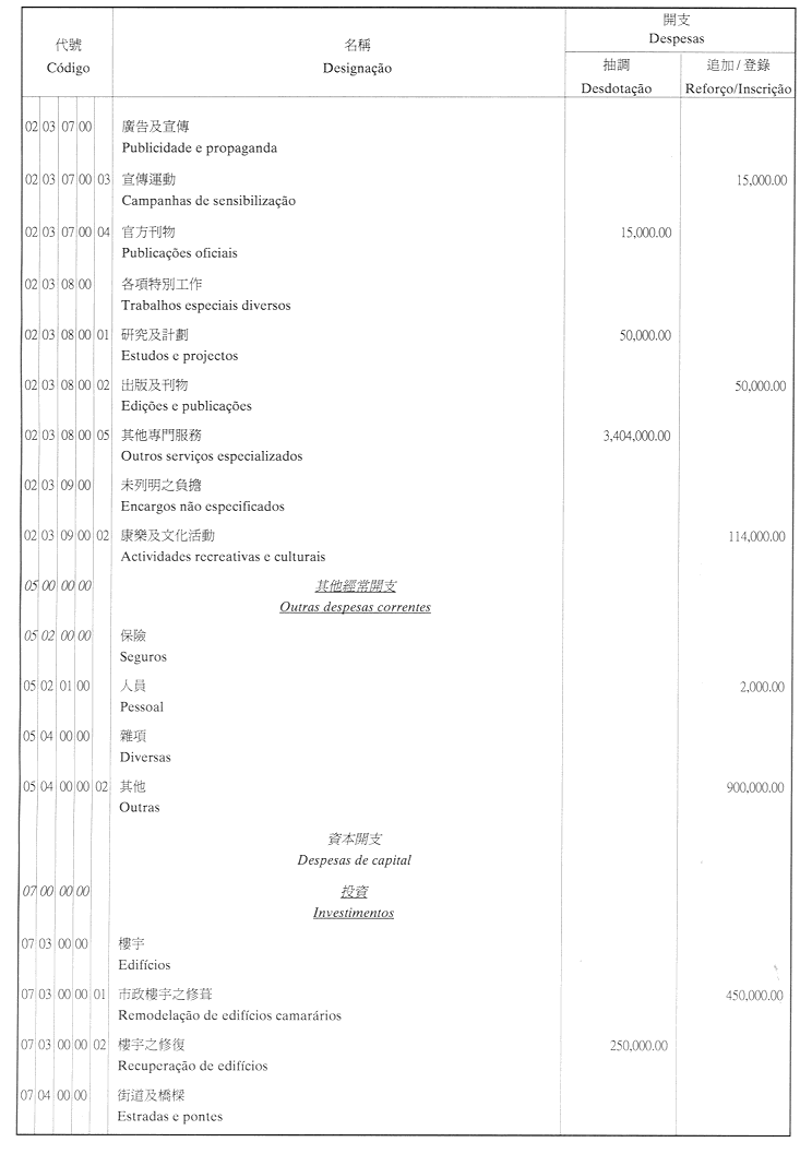 茲聲明根據十二月二十七日第11/93/M號法律第二十一條第一、第二及第四款和第二十二條第二款a)項及b)項之規定及按照二零零一年四月十七日市議會決議,並經三月七日第52/2001號行政長官批示所核准之臨時海島市政局本身預算之支出表修改如下: