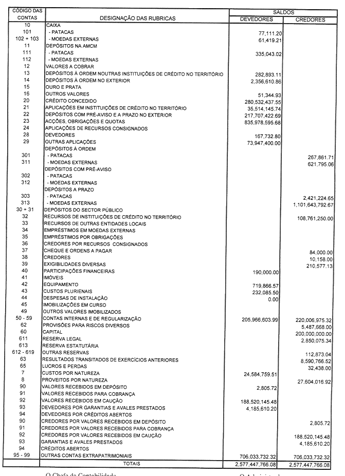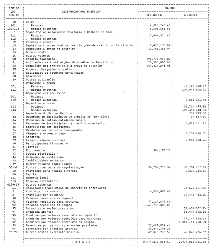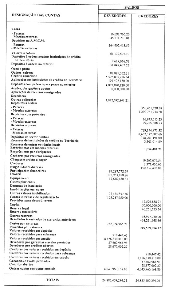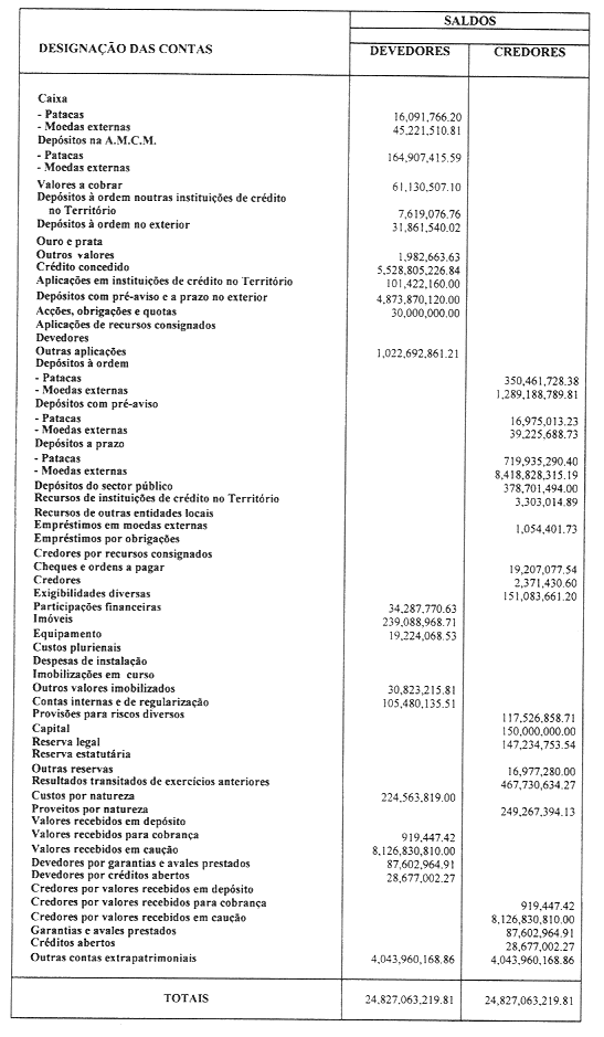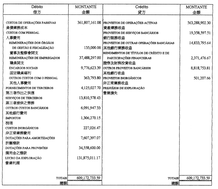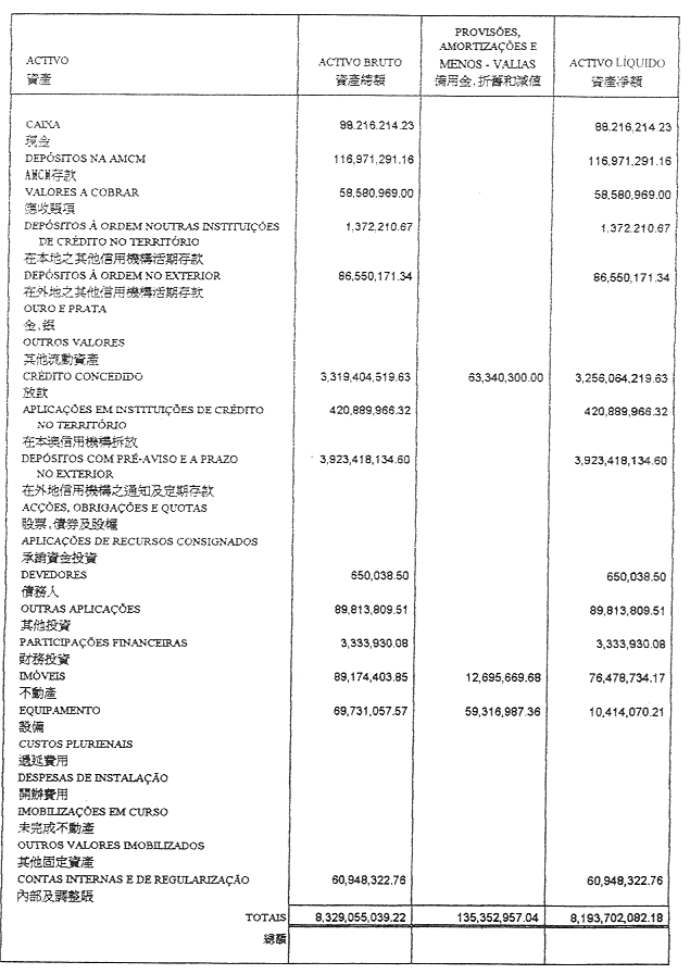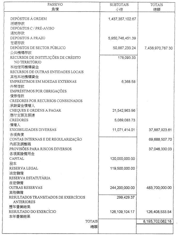 本銀行之資產負債表、營業決算及損益表,係依照本澳銀行法例而編製並經聘請核數師畢馬威會 計師事務所審核完竣,足以顯示本銀行於二零零零年十二月三十一日之真實公平財務狀況及截至該日止之全年溢利。