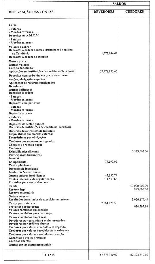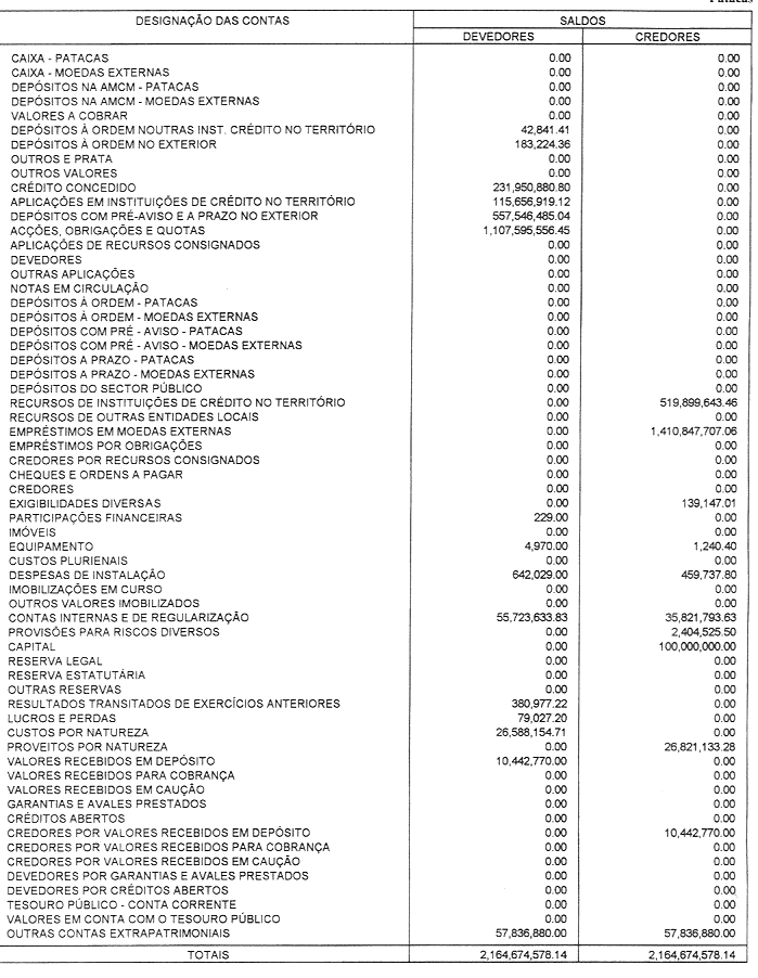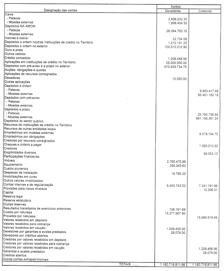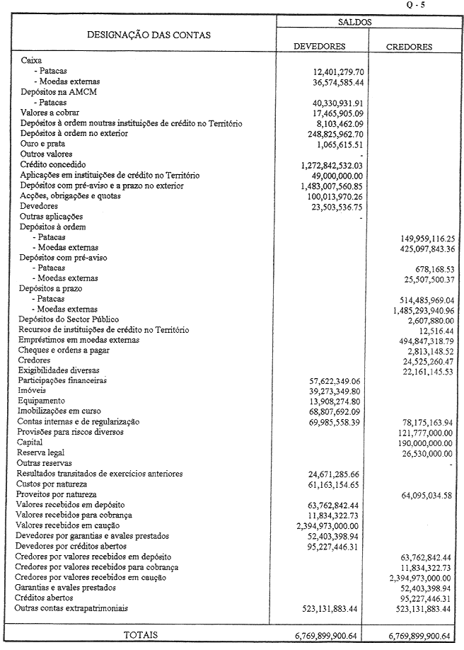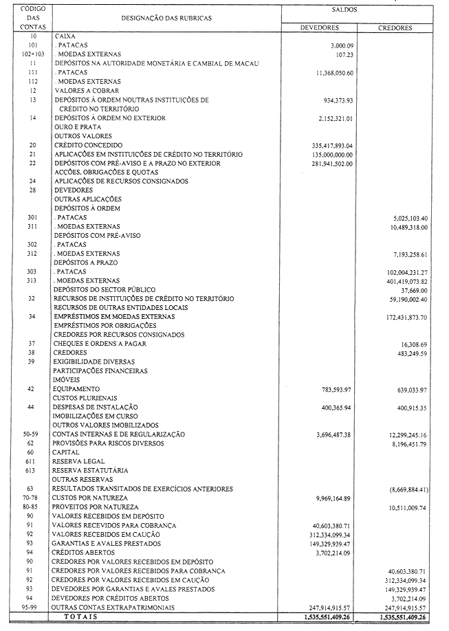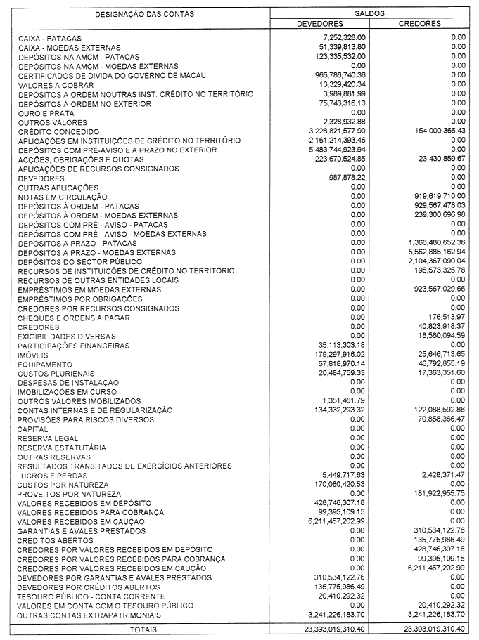 本銀行之資產負債表、營業決算及損益表,係依照本澳銀行法例而編製並經聘請核數師畢馬威會 計師事務所審核完竣,足以顯示本銀行於二零零零年十二月三十一日之真實公平財務狀況及截至該日止之全年溢利。
