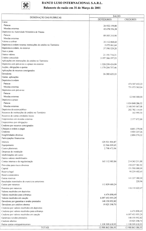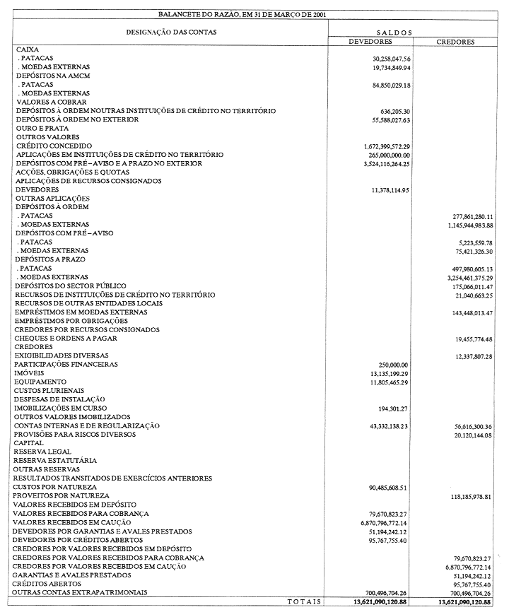 Balancete do razão em 31 de Março de 2001 (Consolidado)