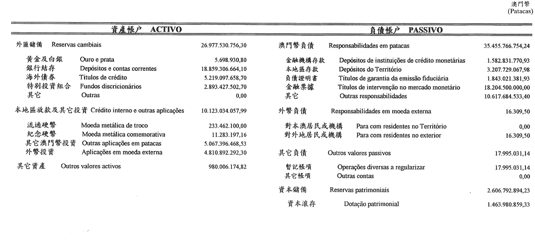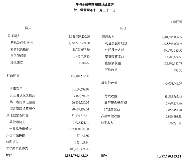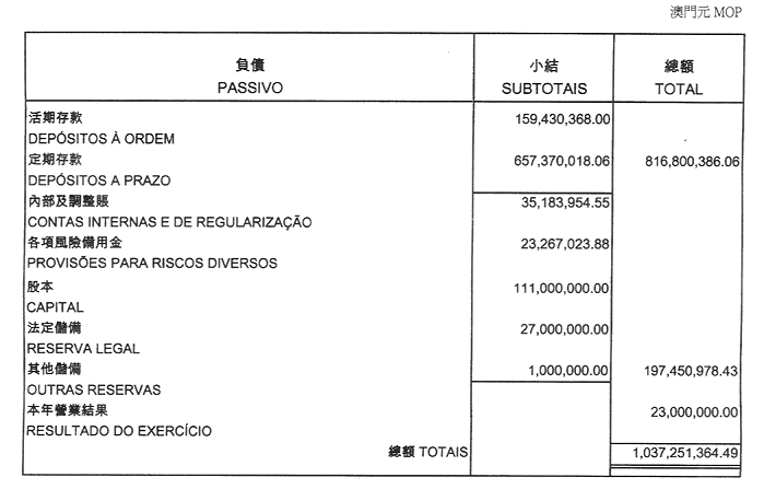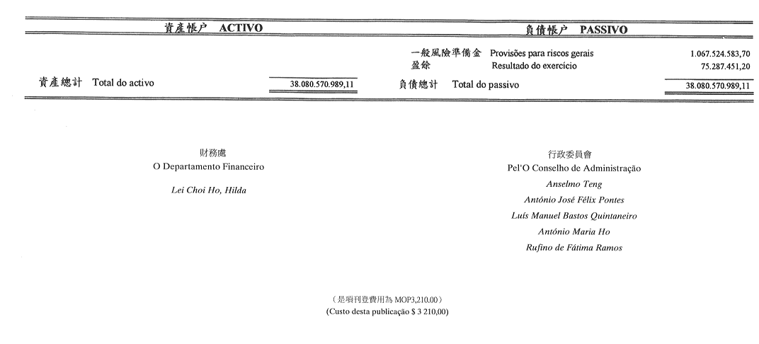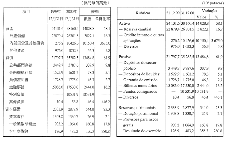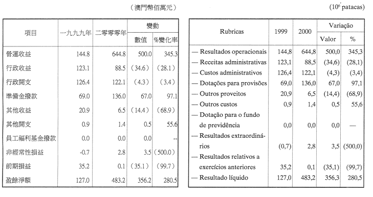 本行認為上述之財務報表均真實與公平地反映 貴局於二零零零年十二月三十一日之財政狀況及 貴局截至該日止年度之營運業績,並已按照為配合澳門金融體系制定之公定會計制度及根據於一九八五年三月三十日及一九九九年九月二十七日所頒佈的第24/85/M號及第50/99/M號法令內之 貴局規章而妥善編制。