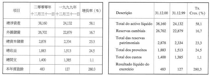 二零零零年年底的存款總額為捌億壹仟柒佰萬澳門元,與前一年比較上升了二十八個百分點。