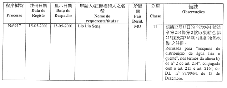 申請人: Tong Wing Ming, 10, Beco do Gonçalo, Edif. Siu Cheong 2B, Macau, China.