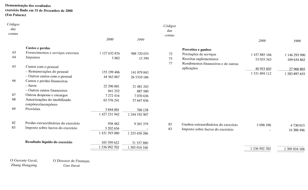 O encerramento financeiro do ano de 2000 releva um lucro de MOP 1 122 429. Foi declarada uma distribuição como dividendos do lucro de MOP 600 000. A quantia de MOP 280 607 foi transferida para o fundo de reserva legal e o saldo do lucro no valor de MOP 241 822 será transferido como resultados transitados para o ano 2001.
