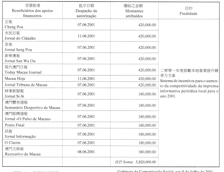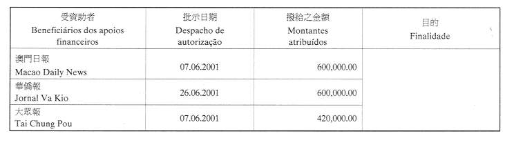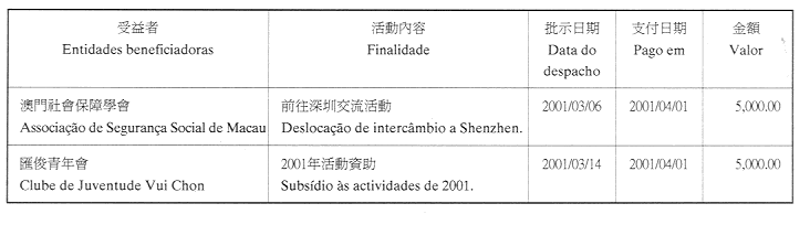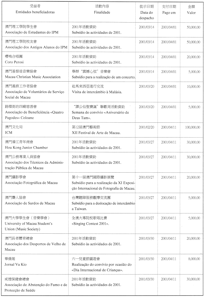 為履行關於撥給私人和私人機構的財政資助的八月二十六日第54/GM/97號批示,新聞局現公佈二零零一年第二季度的資助名單: